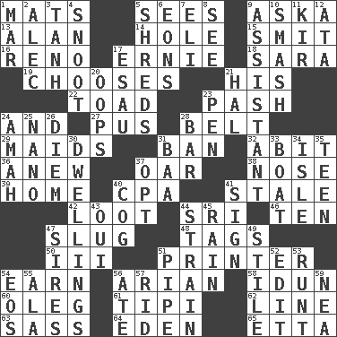 ACROSS 1. Floor coverings 5. Perceives with the eye 9. "____ silly question..." 13. Actor Alda or Thicke 14. Hollow 15. Stricken, poetically 16. Western Nevada city 17. Bert's buddy 18. "Two Mules for Sister ____" 19. Opts 21. Part of HMS, perhaps 22. Frog relative 23. Romantic infatuation 24. Also 27. Suppuration 28. Waist strap 29. Unmarried girls 31. Bar 32. "This won't hurt ____!" 36. Afresh 37. Rowing implement 38. Sense of smell 39. Residence 40. Tax preparer (abbr.) 41. Showing deterioration from age 42. Plunder 44. Indian title of respect (Mr.) 46. Nine, plus one 47. Strike heavily 48. Labels 50. One more than two 51. Hard copy producer 54. Merit 56. Believer in; advocate of (suffix) 58. Goddess of spring and wife of Bragi 60. Cassini of fashion 61. Native american tent (variation) 62. Actor's bit 63. Backtalk 64. Paradise 65. Singer James DOWN 1. Third mo. 2. Actor Baldwin 3. Hyperbolic tangent 4. Snout, nose 5. Tears up 6. Immeasurably long periods of time 7. Connecticut Ivy Leaguer 8. Perceive with the eye 9. Helper 10. Box-office sellout 11. Apertif with cassis 12. "One Day ___ Time" 17. He sold his birthright 20. I made a mistake 21. Actor Linden 23. Fenced enclosure 24. Wet nurse 25. Billionth: prefix 26. South Vietnam president (1954) 28. Oblong piece of solid material 30. Residences 31. Sound made by sheep 33. Water vessel 34. Small island 35. Adolescent 37. Elect 40. Gear tooth 41. Signal 43. Fr. "Yes" 44. Put through a sieve 45. Water falling in drops from the sky 47. Begets 49. Vertical member of a panel or frame 51. Corncob 52. Prepare for publication 53. The smallest animal of a litter 54. Greek goddess of the dawn 55. Wing 56. Had dinner 57. To free from 59. Teachers' org.
