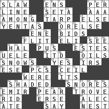 ACROSS 1. Cole _ (cabbage dish) 5. Followers of ems 8. For each 11. Actor's bit 12. Bristle 14. Auto club (abbr.) 15. Amid 17. Canvas cover 18. Otherwise 19. Gossips 21. Threatening words 23. Compass dir. 25. Auction offers 26. Sudden quick movement 27. Connecticut Ivy Leaguer 28. Observe 31. Actor Linden 33. Festering 35. _____ Park, CO 37. Ubangi River tributary 38. It would 40. Petroleums 41. Frozen precipitation (plural) 43. Consenting reply 45. Big collection agency 46. Compass dir. 47. Personal Computers (abbr.) 50. To provide with a ceiling 52. Past tense of be (plural) 53. ___ a Wonderful Life 54. Cast a shadow over 56. Sounds asleep 61. Arab leader 62. Lightbulb-shaped fruit 65. Collection of objects 66. To free from 67. Celtic language 68. Actor Baldwin 69. Had dinner 70. Declare 71. Egg locale DOWN 1. Kill 2. Welles in "The Third Man" 3. At once, immediately (arch.) 4. Left 5. Eastern Standard Time (abbr.) 6. Teachers' org. 7. Disco prop 8. Friends 9. Comfort 10. Actress Charlotte 13. Showery time 16. Highlander 18. Raised railways 20. Sever or remove by pinching or nipping 22. Singer Brickell 24. Needle holder 26. Soared 28. Tumult 29. Snakelike fish 30. Curvy letter 31. Coop moms 32. Medicinal plant 34. Filthy place 36. Land 37. Purpose 39. Tenth: prefix 42. Hurried 44. Puts into a specified state 48. Streamer paper 49. Spring feasts 51. Is not 52. Armed conflict 54. Stricken, poetically 55. Flintstone garb 57. NW Algerian seaport 58. Hero or heavy, e.g. 59. Nights before holidays 60. Religious group 61. Period 63. White ___ sheet 64. Marina Del _, California