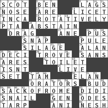 ACROSS 1. Highlander 5. Benjamin's nick name 8. Straggles 12. Characteristic smell of wine 13. "We ___ not amused" (Victoria) 14. It is permitted: Lat. 15. South American Indian 16. Producing rotation 19. Parent Teacher Association (abbr.) 20. Choose not to consume 21. To trail on the ground 23. One (Scot) 24. Ichor 27. Fastener 30. Whimper 31. Fodder prepared in a silo 34. Actor Alda or Thicke 35. Tenth: prefix 38. Collection of objects 40. Without 41. Ancient Greek god of war 42. Bathroom 44. Is not 45. Moving, as bait 46. Arrange properly for use 47. Scottish cap 50. Liveliness 53. Speakers 57. Partially opened flower 59. Italian handbag shop? 63. "You Light Up My Life" star Conn 64. Slow-paced one 65. Commissioned mil. rank 66. Lyric poems 67. Canvas cover 68. Cuckoo 69. Delicate DOWN 1. Clip 2. Continued (abbr.) 3. Witty Wilde 4. Afternoon social gathering 5. Sharp remark 6. Greek god of love 7. Remaining after all deductions 8. 54 in ancient Rome 9. Adept person 10. Set 11. Filthy place 14. Actor's bit 17. American Automobile Association (abbr.) 18. Shallow baking pan 20. Hindu god of fire 22. Help 24. Monetary unit of Botswana 25. ____ Bator, Mongolia 26. Elected reps. 28. Keyboard modifier key 29. Role in a play 30. Soft color 32. Thick or sticky substance 33. Morally bad or wrong 35. Raised platform 36. Celtic language 37. Penny 39. Connecticut Ivy Leaguer 43. Nights before holidays 47. Implement 48. Sandy's bark 49. Make imperfect 51. Stay 52. Unadorned figures 54. Ancient Roman robe 55. Sign of something about to happen 56. Painter Guido (1575-1642) 58. Food container 59. Fast jet (abbr.) 60. Santa ___, CA 61. Auto 62. Monetary unit of Laos 63. Spanish title