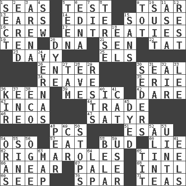 ACROSS 1. Oceans 5. Trial 9. Russian ruler of old 13. Hearing organs 14. Singer Brickell 15. Lush 16. Ship's personnel 17. Pleas 19. "___ Little Indians" 20. Heredity factor (abbr.) 21. Elected rep. 22. Make lace 23. American folk hero Crockett 25. Raised railways 26. Keyboard key 30. Lick closed 34. Rob, plunder, or pillage 35. One of the Great Lakes 36. Peachy ____! 39. Mesonic 42. Have the gumption 43. South American Indian 44. Barter 46. Vintage cars 47. Man with strong sexual desires 48. Personal Computers (abbr.) 51. Son of Isaac 54. Bear (Spanish) 57. Consume 58. Partially opened flower 60. Untruth 62. Frustrating wastes of time 65. Prong on a fork 66. Approach 67. Diluted with white 68. International (abbr.) 69. Ooze 70. Coast Guard woman 71. Afternoon social gatherings DOWN 1. Religious group 2. Having ears or earlike features 3. Sports stadium 4. Compass dir. 5. Adolescent 6. Pulitzer Prize-winning author Ferber 7. Be seated 8. Laconic 9. Small child 10. Costume for a special activity 11. Toward the sea 12. Remainder 15. Without 18. Snakelike fish 20. Unit of force 24. Actresses Bloom and Felton 27. Scottish cap 28. First lady 29. Musical pauses 30. Spring feasts 31. Epoch 32. Atmosphere 33. Area sheltered from the wind 36. Apertif with cassis 37. Compass dir. 38. Environmental prefix 40. Lyricist Gershwin 41. Domesticated feline 45. Colored 48. Lightbulb-shaped fruit 49. Auto 50. Closes up, plugs up 52. Place in a line 53. National forest in Provo, Utah 54. Mouths or openings 55. Trig term 56. Double curve, resembling the letter S 58. Actor Lugosi 59. One who makes use of a thing 61. Snakelike fish 63. Atlas unit 64. Pet locale 65. Teat (slang)