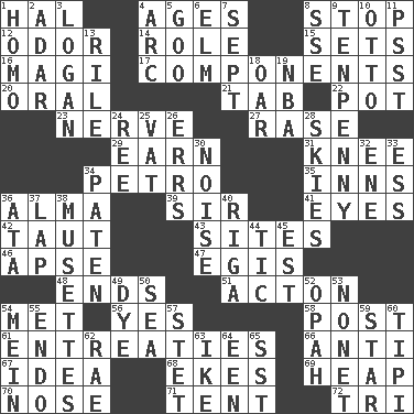 ACROSS 1. Actor Linden 4. Eons 8. Obstruct or block passage 12. Aroma 14. Hero or heavy, e.g. 15. Arranges properly for use 16. Wise men 17. Pieces 20. Of the mouth 21. Keyboard key 22. Cooking vessel 23. Impudent aggressiveness 27. To erase 29. Merit 31. Leg joint 34. Stone: prefix 35. Taverns 36. _ mater 39. Title for a knight 41. Snake ____ (dice throw) 42. Strained 43. Locates 46. Domed church section 47. Armor plate that protects the chest 48. Extremities 51. 13-14th century defensive garment 54. Was introduced to 56. Consenting reply 58. Mail 61. Pleas 66. Against 67. The content of cognition 68. Supplements with great effort 69. Pile 70. Olfactory organ 71. Portable shelter 72. Three (prefix) DOWN 1. Same (prefix) 2. The sixth month of the Jewish calendar 3. Utah city north of Ogden 4. Curve 5. Thick or sticky substance 6. Shade tree 7. Back-to-school mo. 8. Compass dir. 9. 3-inch nail 10. Von Bismarck 11. Inconspicuous attention getter 13. Cause heat under the collar 18. Rowing implement 19. Basketball assoc. 24. To riddle 25. Large container 26. Blunders 28. Atmospheres 30. Annoying sound 32. Compass dir. 33. Curvy letter 34. Eucharist need 36. "One Day ___ Time" 37. Infant locale 38. French bagpipes 40. Port city in Latvia 44. Nervous spasm 45. Eastern Standard Time (abbr.) 49. Color 50. Ocean 52. Brightly colored fish 53. Music written for nine 54. Chow _ 55. Inside; within (prefix) 57. Proofreading order 59. Play the lead 60. Native american tent (variation) 62. Actress Charlotte 63. Mamie's husband 64. Car or cant ending 65. Fast jet (abbr.)