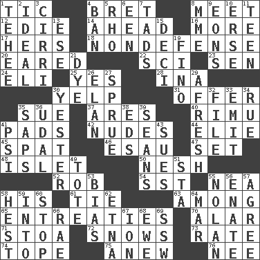 ACROSS 1. Nervous spasm 4. Cy Young winner Saberhagen 8. Confront 12. Singer Brickell 14. At or in the front 16. Greater amount 17. Possessive pronoun 18. Unrelated to defense, as in spending 20. Having ears or earlike features 22. _-fi 23. Elected rep. 24. Connecticut Ivy Leaguer 25. Consenting reply 28. _ tizzy (2 wds.) 30. Sharp bark 31. Auction bid 35. Institute legal proceedings 37. Ancient Greek god of war 40. Tall New Zealand timber tree 41. Groovy apts. 42. Unclothed pictures 44. Writer Wiesel 45. Petty quarrel 46. Son of Isaac 47. Arrange properly for use 48. Small island 50. Delicate 52. Director Reiner 54. Fast jet (abbr.) 55. Teachers' org. 58. Part of HMS, perhaps 61. Make a knot 63. Amid 65. Pleas 70. Having or resembling wings 71. Portico 72. Frozen precipitation (plural) 73. Assign a rank or rating to 74. Drink excessively 75. Afresh 76. Born DOWN 1. Giggle 2. Standard of perfection 3. High-altitude cloud 4. Bar 5. 17th letter of the Greek alphabet 6. Car or cant ending 7. Bits 8. Madame (abbr.) 9. Immeasurably long periods of time 10. Celtic language 11. Adolescent 13. Compass dir. 15. Tenth: prefix 19. A pale, very dry sherry 21. Color 26. Flair 27. Disorder 29. Anew 30. Of or pertaining to yesterday 32. Do some clerical work 33. Send forth 34. Sorrow 35. Plant excrements 36. Hereditary estate 38. Begley and Asner 39. Actors Connery and Penn 41. Air pressure measure (abbr.) 43. Institutes legal proceedings 49. Haul 51. R.R. building 53. Prejudice 55. Pitcher Ryan 56. Related on the mother's side 57. Match 58. Command 59. To the inside or interior of 60. Discontinue 62. Inactive volcano in Sicily 64. Spoil 66. Actress Charlotte 67. Electrically charged atom 68. She-sheep 69. Compass dir.