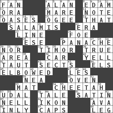 ACROSS 1. Avid follower 4. Actor Alda or Thicke 8. Dutch treat 12. Mouth or opening 13. Female horse 14. Short letter 15. Fertile tracts in a desert 18. Double curve, resembling the letter S 19. Not this but _ 20. Deli grouping 22. Period 23. Actor's bit 24. Enemy 25. Compass dir. 26. Flamboyance 30. Not either 33. The easternmost of the Lesser Sundas 36. Loyal 37. Length times width 39. Automobile 40. Shout 41. Drawn tight 42. Religious groups 44. Raised railways 45. Shoved, as through a crowd 47. French article 50. Teachers' org. 51. Baking chamber 53. Floor protector 54. Leopard's kin 57. Hereditary estate 59. Lie 61. Smooth fabric 63. 1994 drama film starring Jodie Foster 64. Visual representation of an object 65. Actress Gardner 66. In an inward manner 67. Smile enhancers 68. Part of a journey DOWN 1. Egg _ yung 2. Caspian sea tributary 3. Relating to the nose 4. Mine, in Marseilles 5. Fails to keep up a pace 6. "We ___ not amused" (Victoria) 7. Born 8. Plea 9. Capital of the state of Qatar 10. "One Day ___ Time" 11. Was introduced to 16. Writer Wiesel 17. Without 21. Rendezvous 22. Period of immesurable duration 24. Distant 26. Left side of a ship or aircraft 27. Algonquian 28. Frame or body of a ship 29. Snakelike fish 30. Nathan's nickname 31. Taken by mouth 32. Reuben's nickname 34. On the rocks 35. Big _ 38. Lacking a tonal center or key 42. Ocean 43. _ gin 46. Dripping 48. Nights before holidays 49. Bristle 52. Relating to or accompanying birth 53. Promenade 54. Hoof sound 55. Coop moms 56. Hub of activity 57. University (slang) 58. Lair 59. Nervous spasm 60. Alias (abbr.) 62. Tired old horse
