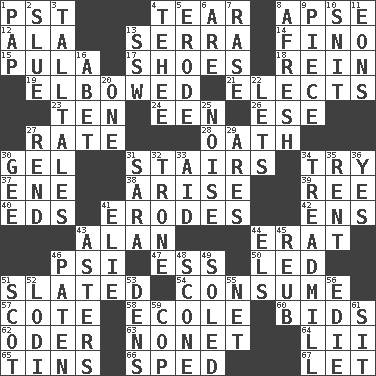 ACROSS 1. Pacific Standard Time (abbr.) 4. Pull into pieces 8. Domed church section 12. Wing 13. Father Junipero _ 14. A pale, very dry sherry 15. Monetary unit of Botswana 17. Imelda's hoard 18. It's straight from the horse's mouth 19. Turned at an angle; bent 21. Chooses 23. "___ Little Indians" 24. Car or cant ending 26. Compass dir. 27. Assign a rank or rating to 28. Pledge 30. Set 31. Flight of steps 34. Attempt to accomplish something 37. Compass dir. 38. Ascend 39. Portuguese money of account (variant) 40. Begley and Asner 41. Eats (away) 42. Followers of ems 43. Actor Alda or Thicke 44. Part of Q.E.F. 46. Air pressure measure (abbr.) 47. Double-curved letter 50. Directed 51. Scheduled 54. Eat 57. ____ d'Azur (French Riviera) 58. Learning spot: Fr. 60. Auction offers 62. River in Europe 63. Music written for nine 64. Cards in a Roman deck? 65. Metal containers 66. Hurried 67. Allow DOWN 1. Infant food 2. Change direction abruptly 3. Baron Munchausen's specialties 4. Giggle 5. Wear away 6. "We ___ not amused" (Victoria) 7. Raze (variant) 8. Anew 9. Part 10. In a ____ (agitated or irritated) 11. Immeasurably long periods of time 13. Compass dir. 16. Collude with 20. Single 22. Allows 25. Annoying sound 27. Tear apart 29. Ancient Greek god of war 30. Turn to the right 31. "Two Mules for Sister ____" 32. Marketplace scale 33. Assist 34. Excercise machine 35. Monthly bill 36. It is so 41. Writer Wiesel 43. Michaelmas daisies 44. Raised railways 45. Reuben's nickname 46. Eucharist need 48. Biscuitlike quick bread 49. Having a sole or soles 51. Highlander 52. Farming town in central California 53. Hiding places for outlaws 55. Fish or hair follower 56. Singer Brickell 59. Police officer (slang) 61. Be seated