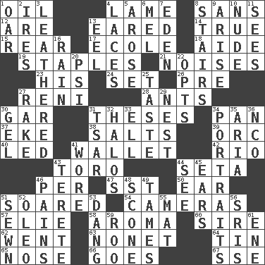 ACROSS 1. Lubricate 4. Unable to walk 8. Without 12. "We ___ not amused" (Victoria) 13. Having ears or earlike features 14. Loyal 15. Rump 17. Learning spot: Fr. 18. Helper 19. Paper fasteners 21. Annoying sounds 23. Part of HMS, perhaps 24. Put into a specified state 26. Before (prefix) 27. Painter Guido (1575-1642) 28. Pismires 30. Slender fish 31. College papers 34. Baking dish 37. Supplement with great effort 38. Table seasonings 39. The grampus (Milton) 40. Directed 41. Place for singles 42. River (Sp.) 43. "Corrida" creature 44. Stalk of a moss capsule 46. For each 47. Fast jet (abbr.) 50. Ewer handle 51. Flew 54. Devices for capturing images 57. Writer Wiesel 58. Scent 60. The founder of a family 62. Gone 63. Music written for nine 64. Metal container 65. Sense of smell 66. Leaves 67. Compass dir. DOWN 1. Rowing implement 2. Angers 3. Tough but pliablecoriaceous 4. Shoestrings 5. Came up 6. Cartoonist voice _ Blanc 7. Paradise 8. Flight of steps 9. Ascend 10. Unadorned 11. Observes 13. Snakelike fish 16. Precipitation 20. Air pressure measure (abbr.) 22. Elects 25. Clothes sense 27. Immoral or dissolute person 29. Egg locale 30. Set 31. Russian ruler of old 32. Auras 33. Pipe bend 34. Likenesses of persons 35. Operatic vocal solo 36. Non-commissioned officer (abbr.) 41. Had on 43. Cylindrical with tapered ends 44. Perceive with the eye 45. Hearing organs 46. Aches 48. Biscuitlike quick bread 49. Makes less strong or intense 51. Stitched 52. Butter sub 53. Mild oath, euphamism for damn 55. Floor covering 56. Indian titles of respect 59. Friend of Pooh 61. Compass dir.