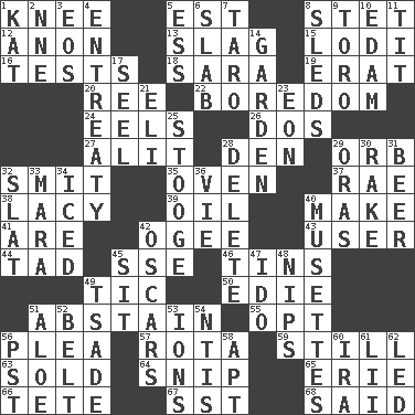 ACROSS 1. Leg joint 5. Eastern Standard Time (abbr.) 8. Proofreading order 12. Soon (poet.) 13. Volcanic refuse 15. Farming town in central California 16. Trials 18. "Two Mules for Sister ____" 19. Part of Q.E.F. 20. To sift 22. Mood resulting from idleness 24. Snakelike fish 26. Two (Sp.) 27. Came down and settled, as after flight 28. Lair 29. Globe 32. Stricken, poetically 35. Baking chamber 37. Actress Charlotte 38. Made of lace 39. Petroleum 40. Create 41. "We ___ not amused" (Victoria) 42. Double curve, resembling the letter S 43. One who makes use of a thing 44. Small boy 45. Compass dir. 46. Canisters 49. Nervous spasm 50. Singer Brickell 51. Refrain by choice 55. Choose 56. Entreaty 57. Roll call or roster of names 59. Free of sound 63. Exchanged or delivered for money 64. Clip 65. 4th largest of the Great Lakes 66. False hair 67. Fast jet (abbr.) 68. Alleged DOWN 1. Krazy ___ of comics 2. Compass dir. 3. Greek goddess of the dawn 4. Plea 5. Double-curved letter 6. Thick slice 7. Pacific island yam 8. Bobsleighs 9. "Corrida" creature 10. Dutch treat 11. Teat (slang) 14. Place where plants grow 17. Sew up the eyelids of hawks and falcons 21. Connecticut Ivy Leaguer 23. A really long time 25. Moe Howard, for one 28. Erase 29. Mouths or openings 30. Libertine 31. Fermented drink made from hops 32. Narrow board 33. Hindu Mythology: god of death 34. On the rocks 36. Compete 40. French bagpipes 42. Motion picture awards 45. Be seated 47. Wedding promise 48. Pinches, bites 49. Sadhe (variant) 51. _ vera 52. Waist strap 53. Charged atoms 54. Nuclear Threat Initiatives 56. Pacific Standard Time (abbr.) 58. Fitting 60. Lyricist Gershwin 61. Cards in a Roman deck? 62. Directed