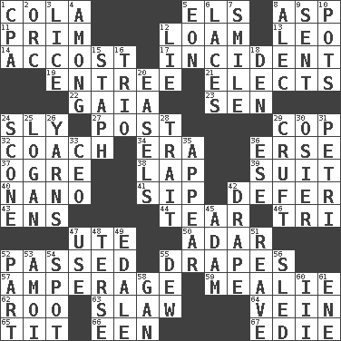 ACROSS 1. Root beer relative 5. Raised railways 8. Cleo's killer 11. Demure 12. Rich soil 13. Lion 14. Buttonhole 17. Happening 19. Main course 21. Opts 22. Greek goddess of the earth (variant) 23. Elected rep. 24. Insidious 27. Mail 29. Police officer (slang) 32. Team commander 34. Epoch 36. Celtic language 37. Legendary monster 38. Pet locale 39. Set or collection 40. Billionth: prefix 41. Small drink 42. Postpone 43. Followers of ems 44. Pull apart 46. Three (prefix) 47. Shoshoni 50. The sixth month of the Jewish calendar 52. Went by 55. Window treatments 57. Electrical Measurement 59. Ear of corn 62. Friend of Pooh 63. Cole _ (cabbage dish) 64. Distinctive style or manner 65. Teat (slang) 66. Car or cant ending 67. Singer Brickell DOWN 1. Accounting whiz (abbr.) 2. The grampus (Milton) 3. Louse (plural) 4. Amid 5. A really long time 6. Shoestrings 7. Grin 8. Actor Baldwin 9. Posted 10. Plant holders 12. Falsehood 15. Staphylococcus 16. Musical group of three 18. Lair 20. Artist's stands 24. Biscuitlike quick bread 25. Utah city north of Ogden 26. Tall tales 28. Distinguishing feature 29. An unpleasant substance 30. Flexible twig of a willow tree 31. _ dish (used to culture cells) 33. Corporate head (abbr.) 35. Seem 36. Compass dir. 42. Window treatment 45. First of billions? 47. Purpose 48. Laconic 49. Peak District village in England 51. Break or tear apart 52. Role in a play 53. Mine, in Marseilles 54. Blemish 55. Morning condensation 56. Downhill vehicle 58. Separate the seeds from cotton 60. One more than two 61. Compass dir.