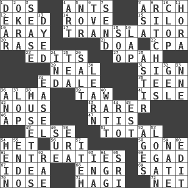 ACROSS 1. Two (Sp.) 4. Pismires 8. Bowlike part 12. Supplemented with great effort 14. Be footloose 15. Grain storage tower 16. Like ___ of sunshine 17. Interpreter 20. Raze (variant) 21. ___ good deed 22. Accounting whiz (abbr.) 23. Proofreads 27. Brightly colored fish 29. Actress Patricia 31. Signal 34. Peak District village in England 35. Adolescent 36. _ mater 39. The 23rd letter of the Hebrew alphabet 41. Capri or Wight 42. Good sense 43. Less widely known 46. Domed church section 47. Nuclear Threat Initiatives 48. Otherwise 51. Add up to 54. Was introduced to 56. RI univ. 58. Went 61. Pleas 66. Mild oath 67. It may be bright or harebrained 68. Engineer (abbr.) 69. Suttee (variant) 70. Sense of smell 71. Wise men 72. Fish or hair follower DOWN 1. Letter starter 2. Gumbo ingredient 3. Gospel singer Marvin 4. Tate display 5. Not either 6. Federal power corp. 7. Post 8. White ___ sheet 9. Actors Guy, Robert Welles, and Clint 10. Hoof sound 11. Israeli folk dance 13. Colored 18. "Barney Miller" actor Jack 19. Pet locale 24. Working for oneself (abbr.) 25. Afternoon social gathering 26. Table seasoning 28. Moving or stirring 30. Acquire or gain knowledge or skills 32. Set 33. Compass dir. 34. Artist's stand 36. Santa ___, CA 37. Trim (branches) 38. French bagpipes 40. Electrical Unit 44. _ de Janeiro 45. Eastern Standard Time (abbr.) 49. Take to court 50. Period 52. Eons 53. Utah city north of Ogden 54. Count _ (2 wds.) 55. Inside; within (prefix) 57. Detail 59. Nathan's nickname 60. Prepare for publication 62. Actress Charlotte 63. _ tizzy (2 wds.) 64. Oval reproductive body of a fowl 65. Indian title of respect (Mr.)
