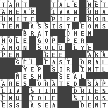 ACROSS 1. Small pie 5. Lie 9. Was introduced to 12. Approach 14. "Terrible" tsar 15. Chief or king in Benin or Nigeria 16. Join together 17. Corncob 18. Director Reiner 19. "___ Little Indians" 20. Help 23. Immeasurably long periods of time 24. Naughty child 25. Sign of something about to happen 27. Undercover agent 30. Grand Old Party 32. For each 33. At once, immediately (arch.) 34. Exchanged or delivered for money 36. Sodium hydroxide 38. Animal enclosure 39. Unit of force equal to gravity 40. Alias (abbr.) 43. Set 46. Compass direction 48. Taken by mouth 49. Slangy assent 51. Title for a knight 52. International (abbr.) 53. Delicate 54. Lick closed 56. Ancient Greek god of war 58. Declaimed 61. Plant excrement 64. 54 in ancient Rome 65. Agitate 66. Frees from moisture 68. Australian flightless bird 69. Lacquered or enameled metalware 70. Grain storage towers 71. Double-curved letter 72. Toward the sea 73. Gouge DOWN 1. Drawn tight 2. Singer Murray 3. It's straight from the horse's mouth 4. Make lace 5. Native american tent (variation) 6. Opinion 7. Portable computer 8. Compass dir. 9. Person of subnormal intelligence 10. Inky black, to poets 11. Bar bills 13. Hitchcock's "____ Window" 21. Sinks 22. Moe Howard, for one 23. Suggestive of the supernatural 24. Benjamin's nick name 26. Cartoonist voice _ Blanc 27. Atlas unit 28. Single 29. Having great length 31. Entreaties 35. Cease 37. Merit 41. Krazy ___ of comics 42. Everything 44. Snake ____ (dice throw) 45. French article 47. Relationship diagram 48. Lubricate 50. Pictures 53. Mole, birthmark 55. Does sums 56. Toward shelter 57. Basketball hoops 59. Cause heat under the collar 60. Length times width 61. Drop; flow; fall 62. A really long time 63. Inconspicuous attention getter 65. R.R. building 67. To free from