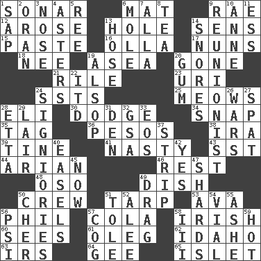ACROSS 1. Underwater navigation system 6. Floor protector 9. Actress Charlotte 12. Came up 13. Opening into or through something 14. Elected reps. 15. Thick mixture 16. Spanish pot 17. Religious women 18. Born 19. Toward the sea 20. Went 21. Cause heat under the collar 23. RI univ. 24. Fast planes 25. Catcalls? 28. Biblical high priest 30. Evade 34. Fastener 35. Label 36. Mexican monetary units 38. Lyricist Gershwin 39. Prong on a fork 41. Difficult 43. Fast jet (abbr.) 44. Believer in; advocate of (suffix) 46. Take ten 48. Bear (Spanish) 49. Food container 50. Ship's personnel 51. Canvas cover 53. Actress Gardner 56. Silvers or Donahue 57. Root beer relative 58. From or relating to Ireland 60. Perceives with the eye 61. Cassini of fashion 62. Potato state 63. Big collection agency 64. Unit of force equal to gravity 65. Small island DOWN 1. Plant excrement 2. NW Algerian seaport 3. Olfactory organ 4. Michaelmas daisies 5. To riddle 6. Undercover agent 7. Silent film actress Nazimova 8. Afternoon social gathering 9. One who advocates reunion 10. Queen of England 1702-14 11. Double-curved letter 13. Stockings 14. Sounds asleep 19. Columnist Joseph or Stewart 20. Chewing product 22. It would 24. Seigniories (variant) 26. Armed conflicts 27. Petty quarrel 28. Singer James 29. Den 31. Lair 32. Girls' org. (abbr.) 33. Greek goddess of the dawn 37. Empty completely 40. Artist's stands 42. Consenting reply 45. Immediately 47. Broken pieces 49. To be drawn or hauled along 50. "Mermaids" star 51. Lacquered or enameled metalware 52. Toward shelter 54. Small bottle 55. American tennis player Robert 56. 23rd letter of the Greek alphabet 57. Gear tooth 58. One more than two 59. Being at a high temperature