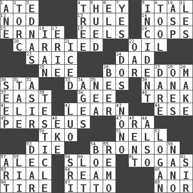 ACROSS 1. Had dinner 4. Those people 8. Slanted text style (abbr.) 12. Lower and raise head in agreement 13. Governing power 14. Olfactory organ 15. Bert's buddy 18. Snakelike fish 19. 911 reaches them 20. Borne 22. Petroleum 23. Ketch in the Levant 24. June honoree 25. Born 26. Mood resulting from idleness 30. R.R. building 33. Natives or inhabitants of Denmark 36. Nanny 37. 90 degrees 39. Turn to the right 40. Long journey 41. Writer Wiesel 42. Acquire or gain knowledge or skills 44. Compass dir. 45. Son of Zeus who helped slay Medusa 47. Mouth or opening 50. Ring climax 51. 1994 drama film starring Jodie Foster 53. Expire 54. "Death Wish" actor 57. Actor Baldwin 59. _ gin 61. Ancient Roman robes 63. Monetary unit of Yemen 64. 480, 500 or 516 sheets of paper 65. Black tropical American cuckoo 66. Become fatigued 67. "Tell ____ the Marines!" 68. Or not DOWN 1. A saturated hydrocarbon 2. Torque (variant) 3. Ferber et al. 4. Woody plant 5. Became colored 6. Pipe bend 7. Affirmative reply 8. Happening 9. Implement 10. Viper 11. French article 16. SW Asia republic 17. One of the Great Lakes 21. On the rocks 22. Rowing implement 24. Two (Sp.) 26. Fermented drink made from hops 27. Have the gumption 28. Singles 29. Create 30. Ooze 31. Lie 32. SW Saudi Arabia district 34. Matures 35. Teachers' org. 38. A testis 42. Nilotic language 43. Words to Nanette 46. Make supply last 48. Monthly bill 49. In addition 52. Utah city north of Ogden 53. Letter starter 54. Water vessel 55. San ____ (Riviera town) 56. Billionth: prefix 57. Tate display 58. Cards in a Roman deck? 59. Indian title of respect (Mr.) 60. Allow 62. Title for a knight