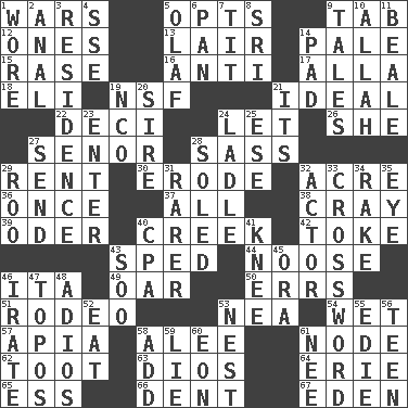 ACROSS 1. Armed conflicts 5. Elects 9. Bar bill 12. Singles 13. Den 14. Light colored 15. Raze (variant) 16. Opposed to 17. Silent film actress Nazimova 18. Connecticut Ivy Leaguer 19. Science/research agcy. 21. Perfect 22. Tenth: prefix 24. Allow 26. A female animal or person 27. Sir (Sp.) 28. Backtalk 29. Monthly bill 30. Eat (away) 32. Land measure 36. At one time in the past 37. 100% 38. Supercomputer manufacturer 39. Baltic tributary 40. Small stream 42. Casino tip 43. Broke a traffic law 44. Trap for birds or small mammals 46. Call ___ day 49. Boat paddle 50. Blunders 51. Cowboy competition 53. Teachers' org. 54. Dripping 57. Capital of Western Samoa 58. Toward shelter 61. Connecting point 62. A blast of a horn 63. "Vaya con ____" 64. One of the Great Lakes 65. Curvy letter 66. Gouge 67. Genesis locale DOWN 1. Had on 2. Of or related to the anus 3. Home 4. Compass dir. 5. Norwegian king 6. Baking dish 7. Teat (slang) 8. _ Lanka 9. Stories 10. Assad's deity 11. Memphis, Tenn. Street 14. Writing tablet 19. Non-commissioned officer (abbr.) 20. Beget 21. ___ a Wonderful Life 23. Keyboard key 24. Dipping utensil 25. Compass dir. 27. Transmit 28. Having a sole or soles 29. Friend of Pooh 31. Less widely known 32. Thespian 33. What you're doing now 34. Immoral or dissolute person 35. Sight organ 40. Tax preparer (abbr.) 41. Leg joint 43. "Barney Miller" actor Jack 45. Mouth or opening 46. Feeling or showing extreme anger 47. Traditional theme or motif 48. Goodbye (Sp.) 52. Ingest 53. Egg locale 55. Singer Brickell 56. Adolescent 58. Find the sum of 59. Whopper 60. Period of immesurable duration 61. Born