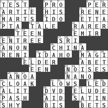 ACROSS 1. Trial 5. Adept person 8. For each 11. Nick name for Arthur 13. Part of HMS, perhaps 14. French philosopher Descartes 15. Shops 16. Wedding promise 17. Singer James 18. Parent Teacher Association (abbr.) 19. Falsehood 21. More valued for its uncommonness 22. Adolescent 24. Arab leader 25. Main course 27. _ Lanka 29. Soon (poet.) 30. Large country 32. Painter Guido (1575-1642) 33. Potato state 35. Wise men 39. A person who is older than you are 41. Collude with 42. Car or cant ending 43. Annoying sounds 45. Small Philippine buffalo 48. Billionth: prefix 49. Loose outer garment 50. Moos 52. Directed 55. Came down and settled, as after flight 56. Movie disc 57. Evade 59. Romantic infatuation 60. Assist 61. Smooth fabric 62. Like a shrinking violet 63. Altar cloth linen 64. Antes DOWN 1. Pack (down) 2. Part of Q.E.F. 3. Ski resort town in Vermont 4. Teat (slang) 5. Silvers or Donahue 6. Travel on an animal 7. Bear (Spanish) 8. _ dish (used to culture cells) 9. Keyboard key 10. Posterior 12. First name in cosmetics 14. 480, 500 or 516 sheets of paper 20. A saturated hydrocarbon 21. It's straight from the horse's mouth 23. Bert's buddy 25. Hearing organ 26. Compass dir. 27. Quiet! 28. _ de Janeiro 30. Automobile 31. With great haste 33. Binary compound 34. Lair 36. Utter; complete 37. Unit of force equal to gravity 38. It is 40. Path through which fluid escapes 43. Compass dir. 44. Fertile tracts in a desert 45. Assad's deity 46. Annoyingly loud 47. Pledge 49. Smile enhancers 50. 57 in ancient Rome 51. Probability 53. Prepare for publication 54. Cub Scout units 56. Pat or tap gently 58. Experiment locale