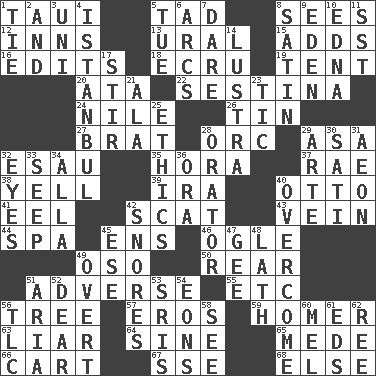 ACROSS 1. "Change" in Tahitian 5. Small boy 8. Perceives with the eye 12. Taverns 13. Mountain range 15. Sums up 16. Proofreads 18. Shade of tan 19. Portable shelter 20. _ moment's notice (2 wds.) 22. French poetic form 24. "Death on the ____" 26. Shallow baking pan 27. Naughty child 28. The grampus (Milton) 29. White ___ sheet 32. Son of Isaac 35. Israeli folk dance 37. Actress Charlotte 38. Shout 39. Lyricist Gershwin 40. Von Bismarck 41. Snakelike fish 42. Leave at once 43. Distinctive style or manner 44. Health resort 45. Followers of ems 46. Stare at amorously 49. Bear (Spanish) 50. Hitchcock's "____ Window" 51. Contrary to your interests or welfare 55. And so on (abbr.) 56. Relationship diagram 57. Greek god of love 59. Home run 63. One who doesn't tell the truth 64. Trig term 65. Ancient Persian 66. Heavy open wagon 67. Compass dir. 68. Otherwise DOWN 1. Standoff 2. Plus 3. Corn or form start 4. Byzantium, centuries later 5. Third day of the wk. 6. Arches 7. Have the gumption 8. Smooth fabric 9. Paradise 10. Pulitzer Prize-winning author Ferber 11. Fast jet (abbr.) 14. A period of five years 17. Agitate 21. Wing 23. Nervous spasm 25. Value system 28. Speaker 29. Johnson of "Laugh-In" 30. Suttee (variant) 31. Period of immesurable duration 32. Snake ____ (dice throw) 33. Ooze 34. Silent film actress Nazimova 36. Mouth or opening 40. Conquer 42. Sounds asleep 45. Compass dir. 47. Turn to the right 48. Thin strip of wood or metal 49. Unconcealed 51. Roberta Peters solo 52. Letter starter 53. Indian titles of respect 54. Immeasurably long periods of time 56. Affectionate concern, for short 58. Observe 60. Cartoonist voice _ Blanc 61. Begley and Asner 62. To sift