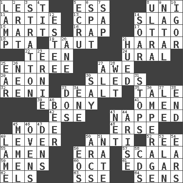 ACROSS 1. For fear that 5. Double-curved letter 8. Single; one (prefix) 11. Nick name for Arthur 13. Accounting whiz (abbr.) 14. Volcanic refuse 15. Shops 16. Reproach for some lapse or misdeed 17. Von Bismarck 18. Parent Teacher Assoc. 19. Drawn tight 21. Ethiopian city, capital of Harari 22. Adolescent 24. Mountain range 25. Main course 27. Deep reverence 29. Age 30. Bobsleighs 32. Painter Guido (1575-1642) 33. Started a card game 35. Lie 39. Black 41. Sign of things to come 42. Compass dir. 43. Slept 45. Method 48. Celtic language 49. Crowbar 50. Against 52. To riddle 55. So be it 56. Period 57. Any of the three canals of the cochlea 59. Not women's 60. Sep. follower 61. _ Allan Poe 62. Raised railways 63. Compass dir. 64. Elected reps. DOWN 1. Desk light 2. Part of Q.E.F. 3. Ski resort town in Vermont 4. Teat (slang) 5. Shade of tan 6. Argument over a trivial matter 7. Plant excrement 8. Extremist 9. Brizilian seaport 10. Composer Stravinsky 12. First name in cosmetics 14. Fly high 20. A saturated hydrocarbon 21. Took on color 23. Bert's buddy 25. Ewer handle 26. Born 27. Everything 28. Dripping 30. Declare 31. Ceases 33. Two (Sp.) 34. Compass dir. 36. Electrical Measurement 37. Area sheltered from the wind 38. Conclude 40. Fermented drink made from hops 43. Fish or hair follower 44. Get up 45. Klaipeda city 46. Baking chambers 47. Cub Scout units 49. Unable to walk 50. Curves 51. Nathan's nickname 53. Liveliness 54. Hearing organs 56. Greek goddess of the dawn 58. Music discs