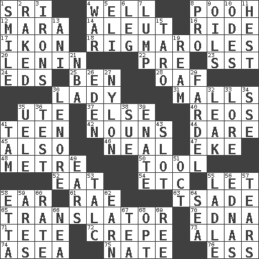 ACROSS 1. _ Lanka 4. Water source 8. "Silly old bear" 12. Hindu Mythology: god of death 14. Eskimo relative 16. Travel on an animal 17. Picture 18. Complicated, petty procedures 20. Soviet premier 1918-24 22. Before (prefix) 23. Fast jet (abbr.) 24. Begley and Asner 25. Benjamin's nick name 28. Clumsy lout 30. Kenny Rogers chart-topper in '80 31. Shopping centers 35. Shoshoni 37. Otherwise 40. Vintage cars 41. Adolescent 42. Parts of speech 44. Have the gumption 45. In addition 46. Anneal 47. Make supply last 48. Distance measurement (Brit.) 50. Implement 52. Ingest 54. And so on (abbr.) 55. Allow 58. Ewer handle 61. Actress Charlotte 63. Sadhe (variant) 65. Interpreter 70. Pulitzer Prize-winning author Ferber 71. False hair 72. Streamer paper 73. Having or resembling wings 74. Toward the sea 75. Nathan's nickname 76. Double-curved letter DOWN 1. Grin 2. Moved through 3. Metal shackles 4. Armed conflict 5. Biblical high priest 6. Part of a journey 7. Mass 8. Adept person 9. Lubricates 10. Lyric poems 11. Command 13. Cuckoo 15. Edible starchy tuberous root 19. 480, 500 or 516 sheets of paper 21. Basketball assoc. 26. Genesis locale 27. Thermoplastic polyamide 29. Pack 30. Poe poem 32. Path through which fluid escapes 33. Old wives' tales, e.g. 34. Compass dir. 35. Ubangi River tributary 36. Trial 38. Institute legal proceedings 39. Related on the mother's side 41. Scottish cap 43. Notch 49. Hearing organs 51. Sep. follower 53. Baby powder 55. Dipping utensil 56. Ferber et al. 57. Pulls into pieces 58. Singer James 59. Ancient Greek god of war 60. Assign a rank or rating to 62. Merit 64. Ocean 66. Teachers' org. 67. Afternoon social gathering 68. Elect 69. Portuguese money of account (variant)
