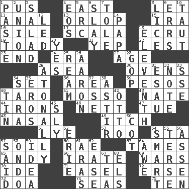 ACROSS 1. Tenth month of the Hindu calendar 4. 90 degrees 8. Allow 11. Of or related to the anus 13. Lowest deck of a ship 15. Retirement account (abbr.) 16. Drop; flow; fall 17. Any of the three canals of the cochlea 18. Shade of tan 19. Sycophant 21. Slangy assent 22. For fear that 23. Conclusion 24. Period 27. Ripen 29. Toward the sea 30. Baking chambers 34. Put into a specified state 36. Type of rug 39. Mexican monetary units 40. Edible starchy tuberous root 41. With motion or animation 43. Nathan's nickname 44. Removes the wrinkles 46. Remaining after all deductions 47. Third day of the wk. 48. Rhinal 49. Hankering 51. Potassium hydroxide 53. Friend of Pooh 54. R.R. building 57. Land 60. Actress Charlotte 63. Softens 65. "60 Minutes" Commentator Rooney 66. Feeling or showing extreme anger 69. Armed conflicts 70. Binary compound 71. Artist's stand 72. Celtic language 73. ___ good deed 74. Oceans 75. "___ Little Indians" DOWN 1. Thick mixture 2. The state of being joined or united 3. First course 4. Greek goddess of the dawn 5. Curve 6. Kill 7. Lacquered or enameled metalware 8. Louse (plural) 9. Blunders 10. Drawn tight 12. Directed 14. Dad 18. Veterans Day date 20. It is so 25. 480, 500 or 516 sheets of paper 26. Composer Copland 28. Republican Party 29. Lacking a tonal center or key 31. Son of Isaac 32. Make mention of 33. Compass dir. 34. "Two Mules for Sister ____" 35. Greek god of love 37. Compass dir. 38. Moving or stirring 40. Shallow baking pan 42. Von Bismarck 45. Cunning 50. Small bed 52. One of the Great Lakes 54. Don Adams' spy role 55. Laconic 56. NE Netherlands city 57. Alleged 58. Southwest Nigerian state 59. It may be bright or harebrained 61. Caspian sea tributary 62. Comfort 64. Deep reverence 67. Beverage made from leaves 68. Raised railways