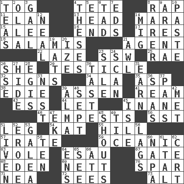 ACROSS 1. Coat; cloak 4. Wig 8. Reproach for some lapse or misdeed 11. Liveliness 13. Froth on beer 14. Hindu Mythology: god of death 15. Toward shelter 16. Extremities 17. Angers 18. Deli grouping 21. Rep 22. Goldbrick 23. Compass dir. 25. Actress Charlotte 26. A female animal or person 29. A testis 32. Omens 34. In the manner of 35. Viper 38. Singer Brickell 39. NE Netherlands city 41. 480, 500 or 516 sheets of paper 43. Double-curved letter 44. Allow 45. Lacking in sense or substance 46. Storms 50. Fast jet (abbr.) 51. Part of a journey 54. Krazy ___ of comics 55. Land elevation 57. Feeling or showing extreme anger 59. Pertaining to the sea 63. Grand slam 64. He sold his birthright 67. Yard entry 68. Locale of original sin 69. Remaining after all deductions 70. Coast Guard woman 71. Teachers' org. 72. Perceives with the eye 73. The first octave above the treble staff DOWN 1. Afternoon social gatherings 2. Spanish pot 3. Highlander 4. College papers 5. Car or cant ending 6. Bit 7. Begley and Asner 8. More uncommon 9. Sports stadium 10. Thick mixture 12. Actress Patricia 14. Russian fighter aircraft 19. Floor coverings 20. Ending with capital 21. Leather borer 23. Filth; sediment 24. Examine minutely or intensely 26. Compass dir. 27. Flintstone garb 28. The front part of a cuirass 30. Clothes sense 31. Merit 33. Egg locale 36. Oceans 37. Baking dishes 39. _ mater 40. Back-to-school mo. 42. Was introduced to 45. Small island 47. Supplement with great effort 48. Yells 49. Nervous spasm 51. Make or become more lively 52. Wear away 53. An organ shaped like a helmet 56. Straggles 58. Nine, plus one 60. California wine valley 61. Slanted text style (abbr.) 62. Certainty 64. Followers of ems 65. Observe 66. Had dinner