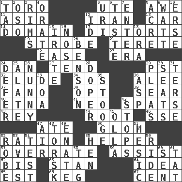 ACROSS 1. "Corrida" creature 5. Shoshoni 8. Deep reverence 11. SW Saudi Arabia district 12. SW Asia republic 13. Auto 14. Realm 17. What propaganda does 19. Disco prop 21. Cigar-shaped 22. Comfort 23. Period 24. Daniel's nick name 27. Watch over 29. Pacific Standard Time (abbr.) 32. Dodge 34. Mayday 36. Toward shelter 37. Papal veil 38. Choose 39. Wither 40. Inactive volcano in Sicily 41. Modern: prefix 42. Arguments over trivial matters 43. Marina Del _, California 44. Carrot, for example 46. Compass dir. 47. Had dinner 50. Seize upon or latch onto something 52. Food allowance for one day 55. Aide 57. Make much ado about nothing 59. Aid 62. Altar cloth linen 63. Comedian Laurel of Laurel & Hardy 64. The main thing one is thinking about 65. Eastern Standard Time (abbr.) 66. Barrel 67. Penny DOWN 1. Small boy 2. Bear (Spanish) 3. Basketball hoops 4. Declaim 5. RI univ. 6. Clothes sense 7. Keyboard key 8. Land measure 9. Electrical Unit 10. Celtic language 12. Binary compound 15. Feeling or showing extreme anger 16. Characteristic smell of wine 18. Mouth or opening 20. Gillaume's butler role 24. Put off 25. Having winglike extensions 26. Pet term 28. Drug addict 29. Entreaties 30. Theater features 31. Laconic 33. ___ good deed 35. Moe Howard, for one 36. Cleo's killer 42. Halts 45. Water jar 47. Atmosphere 48. Cod relative 49. Related on the mother's side 51. Of or pertaining to a meson 52. Loose flowing garment 53. Deliberation 54. Trial 55. Layer 56. Travel on or in a vehicle 58. Label 60. Elected rep. 61. Make lace