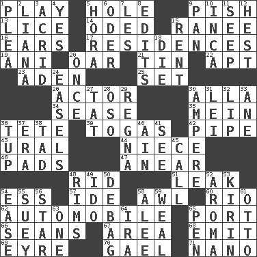 ACROSS 1. Live dramatic performance 5. Hollow 9. Expression of disdain 13. Louse (plural) 14. Wrote a lyric poem 15. Indian princess (variant) 16. Hearing organs 17. Dwellings 19. Black tropical American cuckoo 20. Rowing implement 21. Shallow baking pan 22. Fitting 23. An important port of Yemen 25. Arrange properly for use 26. Thespian 30. Silent film actress Nazimova 34. Gospel singer Marvin 35. Count _ (2 wds.) 36. Wig 39. Ancient Roman robes 42. Corncob 43. Mountain range 44. Sibling's daughter 46. Writing tablets 47. Approach 48. To free from 51. Path through which fluid escapes 54. Double-curved letter 57. Binary compound 58. Leather borer 60. River (Sp.) 62. Form of transportation 65. Left side of a ship or aircraft 66. Seines 67. Length times width 68. Send forth 69. Jane of fiction 70. Highlander 71. Billionth: prefix DOWN 1. Entreaty 2. Climbing, woody, usually tropical vines 3. Sour-tasting 4. Consenting reply 5. Israeli folk dance 6. River in Europe 7. French article 8. Prepares for publication 9. Baking dish 10. South American Indian 11. Ooze 12. Behest 15. Monthly bill 18. Expire 20. At one time in the past 24. Artist's stands 27. Make lace 28. Bear (Spanish) 29. Rain (Swedish) 30. Electrical Unit 31. Luau accessory 32. Mouth edge 33. One (Scot) 36. Uncastrated adult male sheep 37. Epoch 38. Small boy 40. The 18th letter of the Arabic alphabet 41. Perceive with the eye 45. Give a ring to 48. Basketball hoops 49. Wedding promise 50. Debunk (Brit. slang) 52. Scent 53. Japanese brewing company 54. Relaxation 55. Chop _ 56. Play the lead 58. Toward shelter 59. Welt 61. Von Bismarck 63. Single 64. Lyricist Gershwin 65. Fenced enclosure