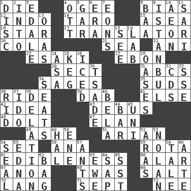 ACROSS 1. Expire 4. Double curve, resembling the letter S 8. Prejudice 12. Southeast Asian peninsula 14. Pacific island yam 15. At sea 16. Play the lead 17. Interpreter 20. Root beer relative 21. Ocean 22. Cuckoo 23. 1973 Nobel Price Winner (Physics) Leo 27. Inky black, to poets 29. Religious group 31. Lettered men learn these first 34. Gurus 35. Soap bubbles 36. Travel on or in a vehicle 39. Pat or tap gently 41. Otherwise 42. The content of cognition 43. Alight from a bus 46. Dunce 47. Style 48. American tennis player Robert 51. Believer in; advocate of (suffix) 54. Arrange properly for use 56. Santa ___, CA 58. Round or rotation of duties 61. The property of being fit to eat 66. Having or resembling wings 67. Small Philippine buffalo 68. It was, poetically 69. Table seasoning 70. Long (Scottish) 71. Back-to-school mo. 72. Born DOWN 1. Plate 2. To the inside or interior of 3. Peak District village in England 4. Baseball player Mel 5. Slender fish 6. Period 7. Immeasurably long periods of time 8. Sound made by sheep 9. Byzantium, centuries later 10. A really long time 11. Indian skirt 13. Mouths or openings 18. Perceive with the eye 19. Experiment locale 24. White ___ sheet 25. Barrel 26. On the rocks 28. Fertile tracts in a desert 30. Sadhe (variant) 32. Music discs 33. Compass dir. 34. Theater features 36. To free from 37. Wedding promise 38. Conveyance 40. Actor Lugosi 44. Tavern 45. Corn or form start 49. Actor Linden 50. Compass dir. 52. Caspian sea tributary 53. Pitcher Ryan 54. Lick closed 55. Pulitzer Prize-winning author Ferber 57. Pismires 59. Story 60. Johnson of "Laugh-In" 62. Container for groceries 63. She-sheep 64. Plant excrement 65. Fast jet (abbr.)