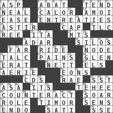 ACROSS 1. Cleo's killer 4. Blind as ____ 8. Watch over 12. Be tempered by heat 14. Bodily heat indicating an inflammation 16. Mine, in Marseilles 17. Relaxation 18. Pleas 20. Moving or stirring 22. Head covering 23. Affectionate concern, for short 24. To riddle 25. Call ___ day 28. Mountains (abbr.) 30. The sixth month of the Jewish calendar 31. Grain storage towers 35. Distant 37. Travel on or in a vehicle 40. Thickened enlargement 41. Baby powder 42. Aches 44. Small, secluded valley 45. Part of Q.E.F. 46. Remaining after all deductions 47. Raised railways 48. Nest on high 50. Immeasurably long periods of time 52. Music discs 54. Actress Charlotte 55. Fast jet (abbr.) 58. White ___ sheet 61. ___ a Wonderful Life 63. Giggle 65. Frustrate 70. Fly high 71. Hero or heavy, e.g. 72. Southeast Indonesia island 73. Elected reps. 74. Inside; within (prefix) 75. Suttee (variant) 76. Compass dir. DOWN 1. Approach 2. Gospel singer Marvin 3. Thick mixture 4. Adept person 5. Bar 6. Keyboard modifier key 7. Torque (variant) 8. Make lace 9. Send forth 10. Christmas carol 11. Plate 13. Luau accessory 15. 480, 500 or 516 sheets of paper 19. Flats, for short 21. To free from 26. Canvas cover 27. Believer in; advocate of (suffix) 29. Burns superficially 30. Northern region 32. Hang loosely or laxly 33. Lyric poems 34. Elected rep. 35. Conductor's collection 36. Having or resembling wings 38. Pass on 39. Keyboard key 41. Afternoon social gathering 43. Portico 49. Prepare for publication 51. Fish or hair follower 53. Proofreading order 55. Imelda's hoard 56. Seines 57. Laconic 58. 43,560 square feet 59. Within a short period 60. Old (Scot.) 62. Indian titles of respect 64. Curvy letter 66. Modern: prefix 67. Wet nurse (var.) 68. Small bed 69. Three (prefix)