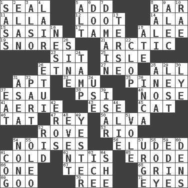 ACROSS 1. Lick closed 5. Say or write further 8. Long, evenly shaped piece 11. Silent film actress Nazimova 12. Spoils 14. Wing 15. Indian antelope 17. Docile 18. Toward shelter 19. Sounds asleep 21. Northern region 23. Be seated 25. Small island 26. Inactive volcano in Sicily 27. Modern: prefix 28. Everything 31. Fitting 33. Australian flightless bird 35. Abounding in pines 37. He sold his birthright 38. Air pressure measure (abbr.) 40. Characteristic smell of wine 41. Nest on high 43. Compass dir. 45. Feline 46. Make lace 47. Marina Del _, California 50. Inventor's middle name 52. Be footloose 53. River (Sp.) 54. Annoying sounds 56. Evaded 61. Having a low temperature 62. Nuclear Threat Initiatives 65. Eat (away) 66. Single 67. Technician 68. Amused look 69. Thick or sticky substance 70. To riddle 71. Sight organs DOWN 1. Backtalk 2. Enthusiasm 3. In addition 4. Den 5. The first octave above the treble staff 6. ___ good deed 7. Realm 8. Indonesian resort city 9. Actor Baldwin 10. Actress Charlotte 13. Laconic 16. Egg locale 18. Had dinner 20. Trig term 22. Hoof sound 24. Pack (down) 26. Needle case 28. Small Philippine buffalo 29. For fear that 30. Potassium hydroxide 31. At sea 32. Piece 34. Purpose 36. South American Indian 37. Erode 39. Austrian river, tributary to the Danube 42. Greek god of love 44. Writer Wiesel 48. Happening 49. Next before 51. Short-tailed, large-bodied rat 52. To free from 54. Words to Nanette 55. Margarine 57. Goad 58. Rowboat 59. Singer Brickell 60. Lairs 61. Gear tooth 63. Frozen water 64. A female animal or person