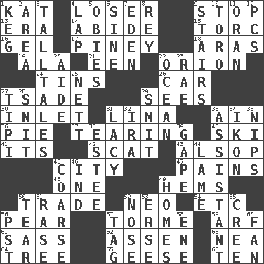 ACROSS 1. Krazy ___ of comics 4. Failure 9. Discontinue 13. Epoch 14. Tolerate 15. Torque (variant) 16. Set 17. Abounding in pines 18. Caspian sea tributary 19. In the manner of 21. Car or cant ending 22. Constellation of myth 24. Metal containers 26. Auto 27. Sadhe (variant) 29. Perceives with the eye 30. An arm off of a larger body of water 31. Pale green bean 33. The 18th letter of the Arabic alphabet 36. Sliced dessert 37. Lacerating 40. What Jean-Claude Killy likes to do 41. It is 42. Jazz singing style 43. Columnist Joseph or Stewart 45. Municipality 47. Aches 48. Single 49. Is hesitant and indecisive 50. Exchange 52. Modern: prefix 54. And so on (abbr.) 56. Lightbulb-shaped fruit 57. Singer Mel 59. Sandy's bark 61. Backtalk 62. NE Netherlands city 63. Teachers' org. 64. Woody plant 65. Honkers 66. "___ Little Indians" DOWN 1. Cask 2. Type of rug 3. Baron Munchausen's specialties 4. Infant locale 5. Off-Broadway awards 6. Trig term 7. Locale of original sin 8. Marina Del _, California 9. Flight of steps 10. "Corrida" creature 11. NW Algerian seaport 12. Personal Computers (abbr.) 20. Helper 22. Sea 23. Actress Charlotte 25. Remaining after all deductions 27. Native american tent (variation) 28. In a ____ (agitated or irritated) 29. Stricken, poetically 31. Made of lace 32. Lyricist Gershwin 33. Helper 34. Visual representation of an object 35. Cuts off 38. First name in cosmetics 39. Yawn 44. Unable to walk 45. Rough 46. Working for oneself (abbr.) 49. Dwellings 50. Rend 51. To erase 52. Characteristic smell of wine 53. Celtic language 55. Algonquian 56. Pacific Standard Time (abbr.) 57. Label 58. Compass dir. 60. Air blower