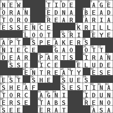 ACROSS 1. ___ Haven, CT 4. Event that recurs at intervals 8. Mature 11. NW Algerian seaport 13. Pulitzer Prize-winning author Ferber 14. Necklace unit 15. "Corrida" creature 16. Buttocks 17. Roberta Peters solo 18. Gist 21. The principal food of baleen whales 22. Spoils 23. Indian title of respect (Mr.) 25. Sight organ 26. Fitting 29. Orators 32. Sibling's daughter 34. E Mali city 35. Baseball player Mel 38. Letter starter 39. Components 41. SW Asia republic 43. Compass dir. 44. Frozen water 45. Dodge 46. Plea 50. Compass dir. 51. Eastern Standard Time (abbr.) 54. A female animal or person 55. Institutes legal proceedings 57. To gather and bind into a bundle 59. French poetic form 63. Torque (variant) 64. Hindu god of fire 67. Goddess of spring and wife of Bragi 68. Celtic language 69. Bar bills 70. Former U.S. Attorney General Janet 71. Observe 72. Part of Q.E.F. 73. White ___ sheet DOWN 1. Make mention of 2. Greek god of love 3. Armed conflicts 4. Cylindrical with tapered ends 5. Binary compound 6. Heredity factor (abbr.) 7. Ewer handle 8. Nest on high 9. Lightheartedly 10. Peak District village in England 12. Christmas carol 14. Long, evenly shaped piece 19. Characteristic smell of wine 20. Police officer (slang) 21. Apertif with cassis 23. Three-handed card game 24. Vintage cars 26. Also 27. Sliced desserts 28. Beverages made from leaves 30. Match 31. The visible part of the earth's surface 33. Algonquian 36. Loyal 37. Bits 39. Essential or central part 40. 1/640 square mile 42. Born 45. Snake ____ (dice throw) 47. Science/research agcy. 48. Help 49. Third day of the wk. 51. _____ Park, CO 52. Dinah or Pauly 53. Laconic 56. Agitate 58. Adept person 60. It may be bright or harebrained 61. Religious women 62. Small Philippine buffalo 64. Had dinner 65. Slender fish 66. Basketball assoc.