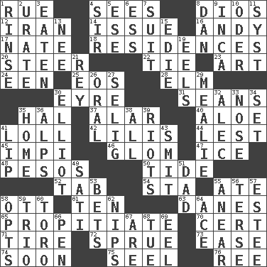 ACROSS 1. Regret 4. Perceives with the eye 8. "Vaya con ____" 12. SW Asia republic 14. Come out of 16. "60 Minutes" Commentator Rooney 17. Nathan's nickname 18. Dwellings 20. Navigate 22. Standoff 23. Tate display 24. Car or cant ending 25. Greek goddess of the dawn 28. Shade tree 30. Jane of fiction 31. Seines 35. Actor Linden 37. Having or resembling wings 40. _ vera 41. Hang loosely or laxly 42. Ms. Damita and namesakes 44. For fear that 45. Body of Kaffir warriors 46. Take by theft 47. Frozen water 48. Mexican monetary units 50. Event that recurs at intervals 52. Bar bill 54. R.R. building 55. Had dinner 58. Baseball player Mel 61. Nine, plus one 63. Natives or inhabitants of Denmark 65. Conciliate 70. Certainty 71. Become fatigued 72. Upset 73. Comfort 74. Within a short period 75. Sew up the eyelids of hawks and falcons 76. To riddle DOWN 1. Remove soap 2. A salt of uric acid 3. Eroded 4. Title for a knight 5. Compass dir. 6. Double-curved letter 7. Set or collection 8. Daniel's nick name 9. South American Indian 10. Baltic tributary 11. System (abbr.) 13. Born 15. Singer Brickell 19. Snakelike fish 21. Marina Del _, California 26. Relating to the mouth 27. Major League Baseball Commissioner Bud 29. Ear of corn 30. American author Paul (1891-1958) 32. Actor Baldwin 33. Olfactory organ 34. Put into a specified state 35. Dwelling 36. High mountains 38. 100% 39. Debaucheries 41. Mouth edge 43. Stricken, poetically 49. Suttee (variant) 51. Male parent 53. Stakes 55. Approach 56. Laconic 57. First name in cosmetics 58. Elects 59. Musical group of three 60. "Corrida" creature 62. Pinches, bites 64. Adept person 66. Fenced enclosure 67. "We ___ not amused" (Victoria) 68. Third day of the wk. 69. Snakelike fish