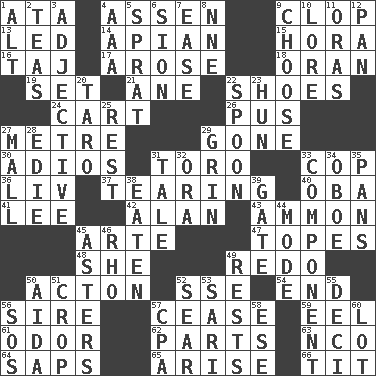 ACROSS 1. "One Day ___ Time" 4. NE Netherlands city 9. Hoof sound 13. Directed 14. Bee-related 15. Israeli folk dance 16. _ Mahal 17. Came up 18. Northwest Algerian city 19. Put into a specified state 21. A saturated hydrocarbon 22. Imelda's hoard 24. Haul 26. Purulenc 27. Distance measurement (Brit.) 29. Went 30. Goodbye (Sp.) 31. "Corrida" creature 33. Police officer (slang) 36. 54 in ancient Rome 37. Lacerating 40. Chief or king in Benin or Nigeria 41. Area sheltered from the wind 42. Actor Alda or Thicke 43. ID or VA city 45. Johnson of "Laugh-In" 47. Drinks excessively 48. A female animal or person 49. Make new 50. 13-14th century defensive garment 52. Compass dir. 54. Conclude 56. Beget 57. Desist 59. Snakelike fish 61. Scent 62. Pieces 63. Non-commissioned officer (abbr.) 64. Plant excrements 65. Ascend 66. Teat (slang) DOWN 1. Keyboard modifier key 2. Beverages made from leaves 3. Descriptive word 4. Auto club (abbr.) 5. Small fatty European fish 6. The Jewish people; Israel 7. Relaxation 8. Compass dir. 9. Elect 10. Old wives' tales, e.g. 11. Mouths or openings 12. Baking dish 20. Pacific island yam 22. Soup utensil 23. Attila the _ 25. Respite 27. Shopping center 28. Singer Brickell 29. Broad smile 31. Story 32. Mouth or opening 33. Part 34. Mitch Miller's instrument 35. Zero-star reviews 38. Eroded 39. Yard entry 44. Method 45. Michaelmas daisies 46. 17th letter of the Greek alphabet 49. Musical pauses 50. Opera by Verdi 51. Riding implement 52. Shrivel 53. Indian skirt 55. Tenth: prefix 56. Distress signal 57. Accounting whiz (abbr.) 58. Compass dir. 60. Car dealer's back yard