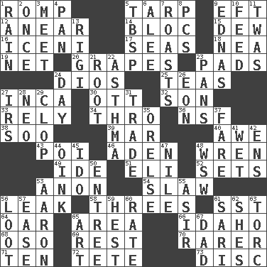 ACROSS 1. Play 5. Canvas cover 9. Lizard (obsolete) 12. Approach 14. Coalition 15. Morning condensation 16. Ancient Celtic tribe of eastern Britain 17. Oceans 18. Teachers' org. 19. Fish or hair follower 20. Wine fruits 23. Writing tablets 24. "Vaya con ____" 25. Beverages made from leaves 27. South American Indian 30. Baseball player Mel 32. Boy, to dad 33. Have confidence or faith in 34. Through, poetically 36. Science/research agcy. 38. "Barney Miller" actor Jack 39. Impair 40. Deep reverence 43. Luau course 46. Arabian gulf 48. Songbird 49. Binary compound 51. Biblical high priest 52. Arranges properly for use 53. Soon (poet.) 54. Cole _ (cabbage dish) 56. Path through which fluid escapes 58. Threesomes 61. Fast jet (abbr.) 64. Rowing implement 65. Length times width 66. Potato state 68. Bear (Spanish) 69. Respite 70. Less widely known 71. Nine, plus one 72. Wig 73. Flat circle DOWN 1. Water falling in drops from the sky 2. Single time 3. Confront 4. Baking dish 5. Cook's measure (abbr.) 6. Toward shelter 7. Exposes to great heat 8. Personal Computers (abbr.) 9. Ferber et al. 10. Nourish 11. It was, poetically 13. Swiss mountan, "Queen of the Mountains" 21. Carrot, for example 22. Respiratory problem 23. Baking dishes 24. 24 hours 26. Period of immesurable duration 27. Big collection agency 28. Modern: prefix 29. Hoof sound 31. Buy and sell 35. Threatening words 37. Conductor's collection 41. Soggy 42. Followers of ems 44. Pig sound 45. Wedding promise 47. The longest river in the world 48. Compass dir. 50. Main course 53. Composer Copland 55. SW Saudi Arabia district 56. Plunder 57. Relaxation 59. Behest 60. Assign a rank or rating to 61. Indian skirt 62. "______ My Girl" (Turtles hit) 63. Torque (variant) 65. Tate display 67. June honoree