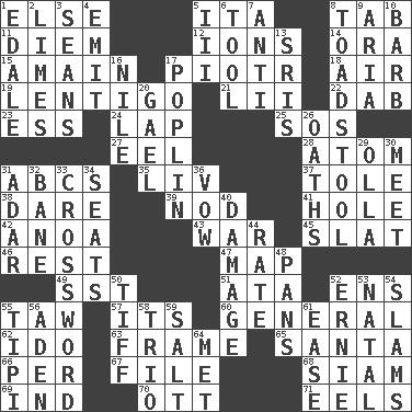 ACROSS 1. Otherwise 5. Call ___ day 8. Bar bill 11. South Vietnam president (1954) 12. Charged atoms 14. Mouth or opening 15. With great haste 17. Peter (Polish) 18. Wind 19. Small, flat, pigmented spot on the skin 21. Cards in a Roman deck? 22. Apply (a substance) by light strokes 23. Double-curved letter 24. Pet locale 25. Distress signal 27. Snakelike fish 28. Smallest unit of an element 31. Lettered men learn these first 35. 54 in ancient Rome 37. Lacquered or enameled metalware 38. Have the gumption 39. Allow head to fall sleepily 41. Opening into or through something 42. Small Philippine buffalo 43. Armed conflict 45. Narrow board 46. Relief 47. Atlas unit 49. Fast jet (abbr.) 51. _ moment's notice (2 wds.) 52. Followers of ems 55. The 23rd letter of the Hebrew alphabet 57. It is 60. Commissioned military rank 62. Wedding promise 63. Movie unit 65. Before Barbara or Clara 66. For each 67. Do some clerical work 68. Thailand, formerly 69. Working for oneself (abbr.) 70. Baseball player Mel 71. Snakelike fish DOWN 1. Peak District village in England 2. Citrus fruits 3. Seines 4. Give off 5. One more than two 6. Implement 7. Opposed to 8. Inedible or poisonous agaric 9. Roberta Peters solo 10. Sharp remark 13. Indian titles of respect 16. The longest river in the world 17. Cotton for raincoats, e.g. 20. Highlander 26. Curses 29. Spanish pot 30. Confront 31. The sixth month of the Jewish calendar 32. Object of repulsion 33. What you're doing now 34. Theater features 36. Solemn pledge 40. Break 44. Pace 48. Zero-star reviews 50. Small quarrel 52. Bert's buddy 53. Relating to or accompanying birth 54. Hits or strikes with great force 55. Native american tent (variation) 56. An important port of Yemen 58. Musical group of three 59. Table seasoning 61. Comfort 64. Was introduced to
