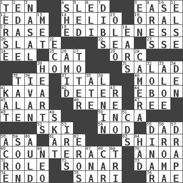 ACROSS 1. Nine, plus one 4. Downhill vehicle 8. Relaxation 12. Dutch treat 14. Sun: prefix 16. Spoken 17. To erase 18. The property of being fit to eat 20. Schedule 22. Ocean 23. Compass dir. 24. Snakelike fish 25. Domesticated feline 28. The grampus (Milton) 30. Same (prefix) 31. First course 35. Standoff 37. Slanted text style (abbr.) 40. Undercover agent 41. Polynesian shrub of the pepper family 42. Prevent from occurring 44. Inky black, to poets 45. Having or resembling wings 46. French philosopher Descartes 47. To separate or throw off 48. Portable shelters 50. South American Indian 52. What Jean-Claude Killy likes to do 54. Dreamland 55. June honoree 58. White ___ sheet 61. "We ___ not amused" (Victoria) 63. Bake eggs in their shells 65. Act in opposition 70. Small Philippine buffalo 71. Hero or heavy, e.g. 72. Underwater navigation system 73. Moist 74. Inside; within (prefix) 75. Indian skirt 76. Actress Charlotte DOWN 1. Laconic 2. Peak District village in England 3. Rhinal 4. A female animal or person 5. Directed 6. Connecticut Ivy Leaguer 7. Rights 8. A really long time 9. Ancient Greek god of war 10. Backtalk 11. Otherwise 13. Was introduced to 15. Margarine 19. Hearing organs 21. Environmental prefix 26. Among 27. Carrier 29. Device for capturing images 30. Centers of feelings and intuitions 32. Ear part 33. _ vera 34. Lair 35. Lie 36. _ the terrible 38. Had dinner 39. Soviet premier 1918-24 41. Krazy ___ of comics 43. Western Nevada city 49. Three-handed card game 51. Music discs 53. Angers 55. Middle Eastern gold or silver currency 56. Scent 57. Window treatment 58. 43,560 square feet 59. Within a short period 60. Old (Scot.) 62. Greek god of love 64. Possessed 66. Modern: prefix 67. Santa ___, CA 68. Auto 69. Three (prefix)