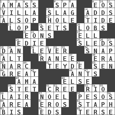 ACROSS 1. Collect or gather 6. Health resort 9. Greek goddess of the dawn 12. Country residence 13. Volcanic refuse 14. Does sums 15. Columnist Joseph or Stewart 16. Opening into or through something 17. Periodic rise and fall of the sea level 18. Trim (branches) 19. Arranges properly for use 20. Tennis shots 21. Immeasurably long periods of time 23. Pipe bend 24. Singer Brickell 25. Bobsleighs 28. Daniel's nick name 30. Crowbar 34. Fastener 35. Keyboard modifier key 36. The wife of a rajah (variant) 38. Epoch 39. Drug cop 41. Miss Universe 1986, Barbara Palacios _ 43. Elected rep. 44. Relatively large 46. Pismires 48. Nursemaid (var.) 49. Otherwise 50. Proofreading order 51. Algonquian 53. River (Sp.) 56. Den 57. Christmas carol 58. Mexican monetary units 60. Length times width 61. Greek god of love 62. Staphylococcus 63. Again 64. Begley and Asner 65. Laconic DOWN 1. Actress Gardner 2. Place where flour is made 3. In addition 4. Had an oblique or slanted direction 5. Plant excrement 6. Notch 7. Friends 8. Grow older 9. The property of being fit to eat 10. Probability 11. Compass dir. 13. "______ My Girl" (Turtles hit) 14. Ringlike coral islands and reefs 19. Scornful expression 20. French article 22. Lubricate 24. Pleas 26. Have the gumption 27. Connect, as a bridge 28. Mild oath, euphamism for damn 29. Having or resembling wings 31. Large container 32. Compass dir. 33. Marina Del _, California 37. Peak District village in England 40. Device for capturing images 42. Followers of ems 45. Make lace 47. Cylindrical with tapered ends 49. Snakelike fish 50. Indian skirt 51. Drawstring 52. Vintage cars 54. Austrian river, tributary to the Danube 55. I made a mistake 56. Experiment locale 57. Born 58. Pacific Standard Time (abbr.) 59. A female animal or person