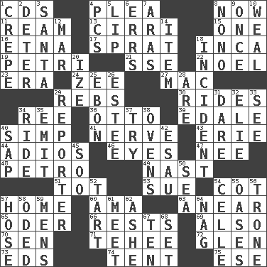 ACROSS 1. Music discs 4. Entreaty 8. Immediately 11. 480, 500 or 516 sheets of paper 13. High-altitude cloud 15. Single 16. Inactive volcano in Sicily 17. Small fatty European fish 18. South American Indian 19. _ dish (used to culture cells) 21. Compass dir. 22. Christmas carol 23. Epoch 24. Last letter of the English alphabet 27. Apple computer (short form) 29. Confederate soldiers (slang) 30. Amusement-park features 34. To riddle 36. "Beetle Bailey" pooch 39. Peak District village in England 40. Simple or foolish person 41. Impudent aggressiveness 43. One of the Great Lakes 44. Goodbye (Sp.) 46. Sight organs 47. Born 48. Stone: prefix 49. Political cartoonist Thomas 51. Small child 53. Take to court 54. Small bed 57. Dwelling 60. Nursemaid (var.) 63. Approach 65. River in Europe 66. Musical pauses 69. In addition 70. Elected rep. 71. Giggle 72. Small, secluded valley 73. Begley and Asner 74. Portable shelter 75. Compass dir. DOWN 1. Streamer paper 2. Prevent from occurring 3. Before Barbara or Clara 4. Personal Computers (abbr.) 5. Mouth edge 6. Blunders 7. Caspian sea tributary 8. Words to Nanette 9. Single time 10. Welt 12. Make imperfect 14. A whole individual unit 18. Event 20. Ending with capital 25. Inky black, to poets 26. First name in cosmetics 28. "We ___ not amused" (Victoria) 29. News announcer 31. Have the gumption 32. Writer Wiesel 33. Observe 34. Travel on or in a vehicle 35. Give off 37. Attempt 38. Baking chambers 40. Plant excrement 42. Son of Isaac 45. "Barney Miller" actor Jack 50. Ocean 52. Small pie 54. Cell (Danish) 55. Fertile tracts in a desert 56. Marketplace scale 57. Stockings 58. Wrote a lyric poem 59. Not women's 61. Confront 62. American tennis player Robert 64. Tired old horse 67. Nine, plus one 68. Arrange properly for use