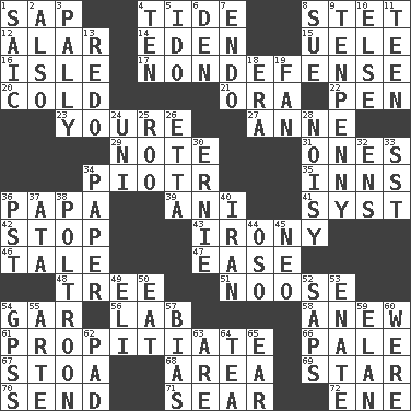 ACROSS 1. Plant excrement 4. Periodic rise and fall of the sea level 8. Proofreading order 12. Having or resembling wings 14. Genesis locale 15. Ubangi River tributary 16. Small island 17. Unrelated to defense, as in spending 20. Lacking warmth 21. Mouth or opening 22. Animal enclosure 23. You are 27. Singer Murray 29. Make mention of 31. Singles 34. Peter (Polish) 35. Restaurants 36. Dad 39. Black tropical American cuckoo 41. System (abbr.) 42. Obstruct or block passage 43. Literary sarcasm 46. Lie 47. Relaxation 48. Family _ (genealogy) 51. Trap for birds or small mammals 54. Slender fish 56. Experiment locale 58. Afresh 61. Conciliate 66. Light colored 67. Portico 68. Length times width 69. Play the lead 70. Transmit 71. Singe 72. Compass dir. DOWN 1. Ketch in the Levant 2. In addition 3. Chummy 4. "___ Little Indians" 5. Wedding promise 6. Lair 7. Inside; within (prefix) 8. Take to court 9. 3-inch nail 10. Otherwise 11. Adolescent 13. Do over again 18. Epoch 19. Air blower 24. University (slang) 25. Friend of Pooh 26. Singer James 28. Annoyingly loud 30. Bert's buddy 32. Followers of ems 33. Fast jet (abbr.) 34. Some stationery 36. Pacific Standard Time (abbr.) 37. "One Day ___ Time" 38. Coward 40. SW Asia republic 44. Bear (Spanish) 45. Modern: prefix 49. Connecticut Ivy Leaguer 50. Erode 52. Plant excrements 53. Maternal 54. Global Positioning Systems (abbr.) 55. Johnson of "Laugh-In" 57. Prejudice 59. Liveliness 60. We are 62. Groovy apt. 63. "We ___ not amused" (Victoria) 64. Afternoon social gathering 65. Hearing organ
