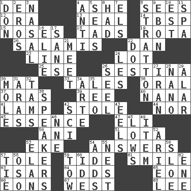 ACROSS 1. Lair 4. American tennis player Robert 8. Perceives with the eye 12. Mouth or opening 13. Actress Patricia 14. Cook's measure (abbr.) 15. Olfactory organs 18. Small amounts or degrees 19. Round or rotation of duties 20. Deli grouping 22. Daniel's nick name 23. Actor's bit 24. Car dealer's back yard 25. Compass dir. 26. French poetic form 30. Floor covering 33. Lies 36. Of the mouth 37. Mouths or openings 39. To riddle 40. Grandmother 41. Desk light 42. Fur scarf 44. Not either 45. Gist 47. Biblical high priest 50. Cuckoo 51. Globular water bottle used in Asia 53. Make supply last 54. Statements in reply to questions 57. Lacquered or enameled metalware 59. Periodic rise and fall of the sea level 61. Grin 63. Austrian river, tributary to the Danube 64. Likelihood 65. A really long time 66. Immeasurably long periods of time 67. 270 degrees 68. Area sheltered from the wind DOWN 1. Spanish title 2. Greek god of love 3. Rhinal 4. Against 5. Oceans 6. Possessed 7. Raised railways 8. Ski resort town in Vermont 9. Inky black, to poets 10. Eastern Standard Time (abbr.) 11. Health resort 16. Writer Wiesel 17. Without 21. Confront 22. Two (Sp.) 24. French article 26. Stitch closed the eyes of (a falcon) 27. SW Asia republic 28. Billionth: prefix 29. Having or resembling wings 30. Undercover agent 31. Ancient river in northeast Turkey 32. Scottish caps 34. Johnson of "Laugh-In" 35. Lion 38. Orators 42. _-fi 43. Snakelike fish 46. Compass dir. 48. Coldest temperatures 49. A distinct part 52. Satellite of Uranus 53. Flair 54. Does sums 55. Egg locale 56. _ gin 57. Standoff 58. Bear (Spanish) 59. Pull behind 60. Binary compound 62. Compass dir.
