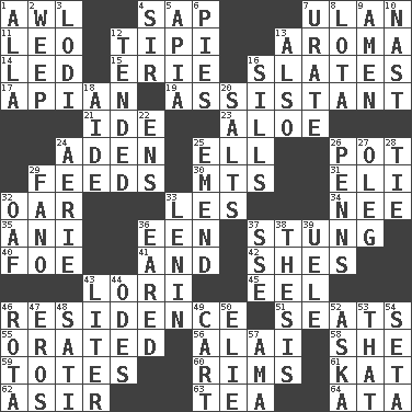 ACROSS 1. Leather borer 4. Plant excrement 7. ____ Bator, Mongolia 11. Lion 12. Native american tent (variation) 13. Scent 14. Directed 15. 4th largest of the Great Lakes 16. Chalkboards 17. Bee-related 19. Helper 21. Binary compound 23. _ vera 24. An important port of Yemen 25. Pipe bend 26. Plant holder 29. Gives food to 30. Mountains (abbr.) 31. Biblical high priest 32. Rowing implement 33. French article 34. Born 35. Cuckoo 36. Car or cant ending 37. Feeling sharp psychological pain 40. Enemy 41. Also 42. "______ My Girl" (Turtles hit) 43. Australian parrot (variant) 45. Snakelike fish 46. Dwelling 51. Theater features 55. Declaimed 56. Jai ____ 58. A female animal or person 59. Lugs 60. Basketball hoops 61. Krazy ___ of comics 62. SW Saudi Arabia district 63. Afternoon social gathering 64. _ moment's notice (2 wds.) DOWN 1. Silent film actress Nazimova 2. Shed a tear 3. Farming town in central California 4. Title for a knight 5. Capital of Western Samoa 6. Sliced desserts 7. A salt of uric acid 8. Globular water bottle used in Asia 9. So be it 10. Political cartoonist Thomas 12. Looked after 13. In addition 16. Beverly of Met fame 18. Helper 20. Table seasonings 22. Followers of ems 24. Nest on high 25. Make improvements or corrections to 26. Actor Sean's family 27. Cassini of fashion 28. Neckwear 29. Papal veil 32. Clumsy lout 33. Soviet premier 1918-24 36. Having ears or earlike features 37. Compass dir. 38. College paper 39. Ubangi River tributary 43. 61 cubic inches 44. Lyric poems 46. Round or rotation of duties 47. Greek god of love 48. Suttee (variant) 49. Haul 50. Writer Wiesel 52. "____ silly question..." 53. Not this but _ 54. Bristle 57. Nanny (var.)
