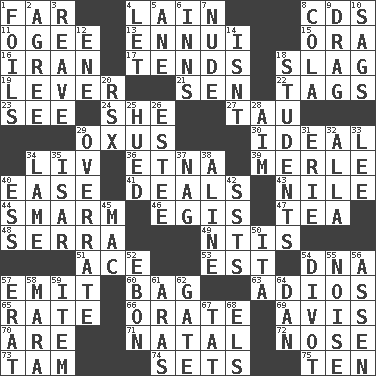ACROSS 1. Distant 4. (Had) reclined 8. Music discs 11. Double curve, resembling the letter S 13. World-weariness 15. Mouth or opening 16. SW Asia republic 17. Watches over 18. Volcanic refuse 19. Prying instrument 21. Elected rep. 22. Labels 23. Observe 24. A female animal or person 27. The 19th letter of the Greek alphabet 29. Amu Darya 30. Standard of perfection 34. 54 in ancient Rome 36. Inactive volcano in Sicily 39. Haggard of country music 40. Relaxation 41. Allots cards 43. Mediterranean tributary 44. Excessive but superficial compliments 46. The front part of a cuirass 47. Afternoon social gathering 48. Father Junipero _ 49. Nuclear Threat Initiatives 51. Adept person 53. Eastern Standard Time (abbr.) 54. Heredity factor (abbr.) 57. Send forth 60. Container for groceries 63. Goodbye (Sp.) 65. Assign a rank or rating to 66. Declaim 69. Deliberation 70. "We ___ not amused" (Victoria) 71. Relating to or accompanying birth 72. Olfactory organ 73. Scottish cap 74. Arranges properly for use 75. "___ Little Indians" DOWN 1. Fencing necessities 2. Match 3. Rob, plunder, or pillage 4. Allow 5. A saturated hydrocarbon 6. Taverns 7. Unadorned 8. Root beer relative 9. To be drawn or hauled along 10. Sinks 12. Compass dir. 14. Is not 18. SAT takers 20. Acura sports coupe 25. Took on color 26. First name in cosmetics 28. Direct toward a target or goal 29. Make much ado about nothing 31. One of the Great Lakes 32. Silent film actress Nazimova 33. Area sheltered from the wind 34. Unable to walk 35. Austrian river, tributary to the Danube 37. Tired old horse 38. Place in a line 40. Double-curved letter 42. Fast planes 45. Big _ 50. Call ___ day 52. Inky black, to poets 54. A piece of turf (Scot.) 55. Annoying sound 56. NE Netherlands city 57. Part of Q.E.F. 58. Hindu Mythology: god of death 59. A distinct part 61. Ancient river in northeast Turkey 62. Yard entry 64. Daniel's nick name 67. Make lace 68. Raised railways