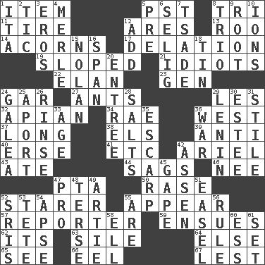 ACROSS 1. A distinct part 5. Pacific Standard Time (abbr.) 8. Three (prefix) 11. Hoop that covers a wheel 12. Ancient Greek god of war 13. Friend of Pooh 14. Oak nuts 17. Conveyance 19. Inclined 21. Foolish or stupid persons 22. Flair 23. Commissioned mil. rank 24. Slender fish 27. Pismires 29. French article 32. Bee-related 34. Actress Charlotte 36. 270 degrees 37. Protracted 38. Raised railways 39. Opposed to 40. Celtic language 41. And so on (abbr.) 42. Satellite of Uranus 43. Had dinner 44. Droops 46. Born 47. Parent Teacher Assoc. 50. To erase 52. A viewer who gazes fixedly 55. Seem 57. Newsperson 59. Follows as a consequence or result 62. It is 63. Drop; flow; fall 64. Otherwise 65. Observe 66. Snakelike fish 67. For fear that DOWN 1. Call ___ day 2. Nervous spasm 3. Greek god of love 4. Haggard of country music 5. Before (prefix) 6. Former Milwaukee Brewers owner Bud 7. Sadhe (variant) 8. Musical group of three 9. Carrot, for example 10. Charged particles 12. Say or write further 15. Pitcher Ryan 16. Connect, as a bridge 18. Metal container 20. Main course 24. An organ shaped like a helmet 25. To the left, to Queeg 26. Wash lightly 28. Table seasonings 29. Soviet premier 1918-24 30. First name in cosmetics 31. Vertical member of a panel or frame 33. Ripen 35. Fortification 36. Armed conflict 42. NE Netherlands city 45. Stare wonderingly 47. Adept person 48. Laconic 49. Nick name for Arthur 51. Artist's stand 52. Indian titles of respect 53. Wig 54. Domed church section 55. "We ___ not amused" (Victoria) 56. General guideline 58. Pipe bend 60. Curvy letter 61. Put into a specified state