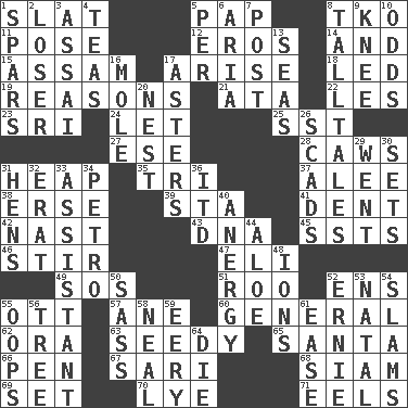 ACROSS 1. Narrow board 5. Infant food 8. Ring climax 11. Airs 12. Greek god of love 14. Also 15. Indian state 17. Originate 18. Directed 19. Thinks logically 21. "One Day ___ Time" 22. French article 23. _ Lanka 24. Allow 25. Fast jet (abbr.) 27. Compass dir. 28. Crow sounds 31. Pile 35. Three (prefix) 37. Toward shelter 38. Celtic language 39. R.R. building 41. Incision 42. Political cartoonist Thomas 43. Heredity factor (abbr.) 45. Fast planes 46. Tumult 47. Connecticut Ivy Leaguer 49. Distress signal 51. Friend of Pooh 52. Followers of ems 55. Baseball player Mel 57. One (Scot) 60. Commissioned military rank 62. Mouth or opening 63. Shabby and untidy 65. Before Barbara or Clara 66. Animal enclosure 67. Indian skirt 68. Thailand, formerly 69. Put into a specified state 70. Potassium hydroxide 71. Snakelike fish DOWN 1. Practice fights 2. Failure 3. Slender Brazilian palm 4. Beverages made from leaves 5. For each 6. Roberta Peters solo 7. Mail 8. Baron Munchausen's specialties 9. Leg joint 10. Likelihood 13. Oceans 16. Undercover agent 17. Michaelmas daisies 20. Egg locale 26. Heaps 29. Gone 30. Puts into a specified state 31. Coop moms 32. Part of Q.E.F. 33. Aide 34. Stone: prefix 36. It would 40. Disorder of the immune system 44. _ vera 48. Charged atoms 50. Backtalk 52. Bert's buddy 53. Brizilian seaport 54. Criticizes harshly 55. I made a mistake 56. Relationship diagram 58. Be tempered by heat 59. Suggestive of the supernatural 61. Comfort 64. Pass on