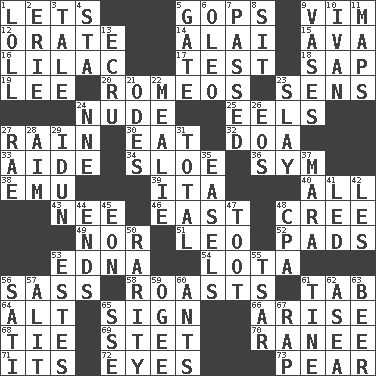 ACROSS 1. Allows 5. Republicans 9. Zeal 12. Speak pompously 14. Mountain range southwest of Kyrgyzstan 15. Actress Gardner 16. Pale purple color 17. Trial 18. Plant excrement 19. Area sheltered from the wind 20. Lover boys 23. Elected reps. 24. Naked 25. Snakelike fish 27. Water falling in drops from the sky 30. Ingest 32. ___ good deed 33. Assistant 34. A type of plum 36. Symbol (abbr.) 38. Australian flightless bird 39. Call ___ day 40. 100% 43. Born 46. Compass direction 48. Algonquian 49. And not 51. Lion 52. Writing tablets 53. Pulitzer Prize-winning author Ferber 54. Globular water bottle used in Asia 56. Backtalk 58. Exposes to great heat 61. Keyboard key 64. The first octave above the treble staff 65. Attach a signature 66. Get up 68. Standoff 69. Proofreading order 70. The wife of a rajah (variant) 71. ___ a Wonderful Life 72. Snake ____ (dice throw) 73. Lightbulb-shaped fruit DOWN 1. Hang loosely or laxly 2. One of the Great Lakes 3. Falsehood 4. R.R. building 5. Yard entry 6. Margarine 7. Went by 8. Be seated 9. Flower holders 10. _ the terrible 11. Atlas contents 13. Shade of tan 21. Lyric poems 22. Ear of corn 23. Kill 24. Compass dir. 26. Greek goddess of the dawn 27. Actress Charlotte 28. Direct toward a target or goal 29. Goddess of spring and wife of Bragi 31. "_____ Recall" 35. Artist's stands 37. Hindu Mythology: god of death 41. Directed 42. French article 44. Extremities 45. A really long time 47. A blast of a horn 48. Accounting whiz (abbr.) 50. Noteworthy scarcity 53. _____ Park, CO 55. Russian ruler of old 56. Suttee (variant) 57. Set down 59. Double curve, resembling the letter S 60. Pismires 61. Prong on a fork 62. Toward the sea 63. Fermented drink made from hops 65. Compass dir. 67. Hit sharply and swiftly