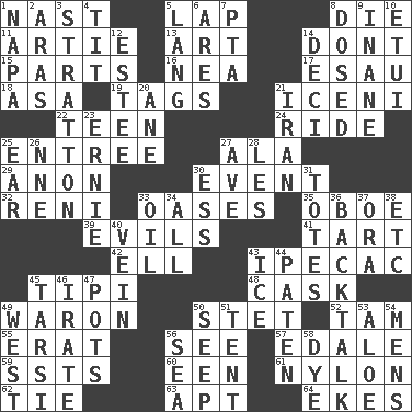ACROSS 1. Political cartoonist Thomas 5. Infant locale 8. Expire 11. Nick name for Arthur 13. Tate display 14. Do not 15. Actors' quests 16. Teachers' org. 17. He sold his birthright 18. White ___ sheet 19. Labels 21. Ancient Celtic tribe of eastern Britain 22. Adolescent 24. Travel on or in a vehicle 25. Main course 27. In the manner of 29. At once, immediately (arch.) 30. Happening 32. Painter Guido (1575-1642) 33. Fertile tracts in a desert 35. Mitch Miller's instrument 39. Vices 41. Small pie 42. Pipe bend 43. Medicinal drug used to evoke vomiting 45. Native american tent (variation) 48. Keg 49. Make _____ (do battle with) 50. Proofreading order 52. Scottish cap 55. Part of Q.E.F. 56. Observe 57. Peak District village in England 59. Fast planes 60. Car or cant ending 61. High-strength synthetic material 62. Standoff 63. Fitting 64. Makes supply last DOWN 1. California wine valley 2. Caspian sea tributary 3. Ski resort town in Vermont 4. Teat (slang) 5. Long (Scottish) 6. Ancient Greek god of war 7. Parent Teacher Assoc. 8. Administered medicine 9. Empty; void 10. Needle case 12. First name in cosmetics 14. Tenth: prefix 20. One (Scot) 21. SW Asia republic 23. Bert's buddy 25. Hearing organ 26. Compass dir. 27. "___ Maria" 28. French article 30. Curvy letter 31. Lugs 33. Petroleum 34. 100% 36. Sass 37. Mouth or opening 38. And so on (abbr.) 40. Distinctive style or manner 43. Frozen water 44. Eucharist need 45. Tarsus (plural) 46. Feeling or showing extreme anger 47. Cooking vessels 49. Compass direction 50. Ooze 51. Portable shelter 53. Medicinal plant 54. Not women's 56. Ocean 58. Color