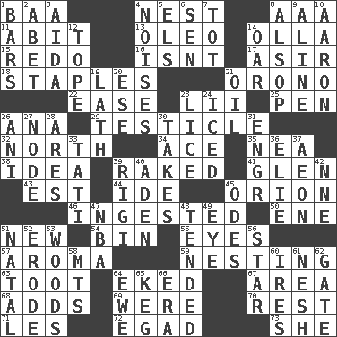 ACROSS 1. Sound made by sheep 4. Egg locale 8. American Automobile Association (abbr.) 11. "This won't hurt ____!" 13. Margarine 14. Water jar 15. Make new 16. Is not 17. SW Saudi Arabia district 18. Paper fasteners 21. U. of Maine site 22. Comfort 23. Cards in a Roman deck? 25. Fenced enclosure 26. Santa ___, CA 29. A testis 32. _ pole 34. Adept person 35. Teachers' org. 38. The main thing one is thinking about 39. Swept the length of 41. Small, secluded valley 43. Eastern Standard Time (abbr.) 44. Binary compound 45. Constellation of myth 46. Swallowed 50. Compass dir. 51. ___ Haven, CT 54. Storage container 55. Sight organs 57. Odor 59. Snuggling 63. A blast of a horn 64. Made supply last 67. Type of rug 68. Sums up 69. Past tense of be (plural) 70. Respite 71. French article 72. Mild oath 73. A female animal or person DOWN 1. Soap units 2. Collude with 3. Opera by Verdi 4. Annoying sounds 5. Raised railways 6. Elected rep. 7. Small child 8. Columnist Joseph or Stewart 9. Place in a line 10. Composer Copland 12. Drink excessively 14. Rowing implement 19. Thin strip of wood or metal 20. Compass dir. 21. Lubricate 23. Louse (plural) 24. On the rocks 26. Black tropical American cuckoo 27. Connecting point 28. Ancient Greek god of war 30. Receives possession of 31. Engineer (abbr.) 33. Jacques of French films 36. Writer Wiesel 37. A really long time 39. Swiss mountan, "Queen of the Mountains" 40. An important port of Yemen 42. Compass dir. 45. Lyric poems 47. Basketball assoc. 48. Watched over 49. Sight organ 51. Brizilian seaport 52. Eat (away) 53. Forest 56. Play the lead 58. Mountains (abbr.) 60. Angers 61. Delicate 62. Yard entry 64. She-sheep 65. Barrel 66. Period