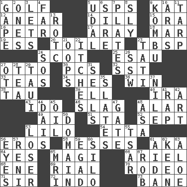 ACROSS 1. _ course 5. United States Postal Service (abbr.) 9. Krazy ___ of comics 12. Approach 14. Deli pickle 15. Mouth or opening 16. Stone: prefix 17. Like ___ of sunshine 18. Third mo. 19. Double-curved letter 20. Rest room 23. Cook's measure (abbr.) 24. Highlander 25. He sold his birthright 27. Von Bismarck 30. Personal Computers (abbr.) 32. Fast jet (abbr.) 33. Afternoon social gatherings 34. "______ My Girl" (Turtles hit) 36. Acquire through effort 38. The 19th letter of the Greek alphabet 39. Pipe bend 40. Lyricist Gershwin 43. Wedding promise 46. Volcanic refuse 48. Having or resembling wings 49. Help 51. R.R. building 52. Back-to-school mo. 53. _ and Stitch 54. Singer James 56. Greek god of love 58. Makes clutter 61. Alias (abbr.) 64. Affirmative reply 65. Wise men 66. Satellite of Uranus 68. Compass dir. 69. Monetary unit of Yemen 70. Cowboy competition 71. Title for a knight 72. _ china 73. Object of repulsion DOWN 1. Yawn 2. Washington bills 3. Allows 4. At a great distance 5. Hereditary estate 6. Beget 7. Food holders 8. Playfully artful 9. Dried seaweed eaten as food 10. Ancient river in northeast Turkey 11. Canvas cover 13. College mil. group 21. I made a mistake 22. Irritating cutaneous sensations 23. Jacques of French films 24. Distress signal 26. Compass dir. 27. Baseball player Mel 28. Afternoon social gathering 29. "Change" in Tahitian 31. Exchanges for money 35. Chalkboards 37. Mediterranean tributary 41. Reproach for some lapse or misdeed 42. Tate display 44. Raised platform 45. Lubricate 47. Yard entry 48. White ___ sheet 50. Realm 53. Failure 55. Russian ruler of old 56. Sight organs 57. Painter Guido (1575-1642) 59. Mild oath 60. Grain storage tower 61. Opera by Verdi 62. Peachy ____! 63. _ vera 65. Medical imaging device (abbr.) 67. Director Reiner