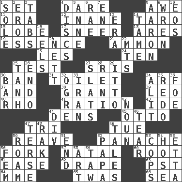 ACROSS 1. Put into a specified state 4. Have the gumption 8. Deep reverence 11. Mouth or opening 12. Empty; void 14. Pacific island yam 15. Ear part 17. Scornful expression 18. Ancient Greek god of war 19. Core 21. ID or VA city 23. French article 24. "___ Little Indians" 25. Trial 27. Indian titles of respect 30. Prohibit 31. Bathroom 34. Sandy's bark 37. Plus 38. Let have 39. Lion 40. 17th letter of the Greek alphabet 41. Food allowance for one day 43. Binary compound 44. Lairs 45. Von Bismarck 47. Three (prefix) 49. Third day of the wk. 50. Break or tear apart 52. Flamboyance 56. Tined utensil 57. Relating to or accompanying birth 60. Carrot, for example 61. Relaxation 62. Window treatment 63. Pacific Standard Time (abbr.) 64. Madame (abbr.) 65. It was, poetically 66. Ocean DOWN 1. Flatfish 2. Greek god of love 3. Bar bills 4. Flat circles 5. Singer Murray 6. Actress Charlotte 7. Compass dir. 8. Composer Copland 9. Songbird 10. Greek goddess of the dawn 13. Epoch 14. Not wild 16. Snakelike fish 20. Remaining after all deductions 22. Mountains (abbr.) 25. Hyperbolic tangent 26. Inside; within (prefix) 27. Narrow boards 28. Painter Guido (1575-1642) 29. "Tell ____ the Marines!" 30. Drinking establishment 32. Legendary monster 33. SW Asia republic 34. Came down and settled, as after flight 35. Redecorate 36. Enemy 42. Part of speech 44. HTML Container Element 46. Rend 47. Laconic 48. Libertine 49. Lies 50. Wander 51. Conclusion 52. Dad 53. 911 reaches them 54. Stockings 55. Singer James 56. Opposite of masc. 58. Tate display 59. The 23rd letter of the Hebrew alphabet