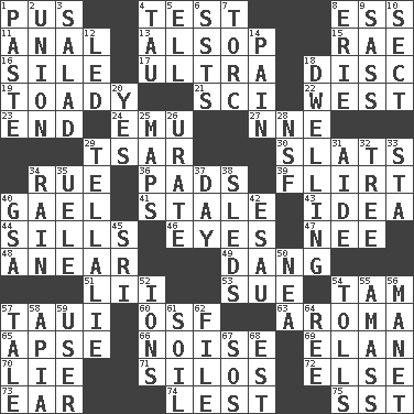 ACROSS 1. Suppuration 4. Trial 8. Double-curved letter 11. Of or related to the anus 13. Columnist Joseph or Stewart 15. Actress Charlotte 16. Filth; sediment 17. Extremist 18. Flat circle 19. Sycophant 21. _-fi 22. Compass direction 23. Conclude 24. Australian flightless bird 27. Compass dir. 29. Russian ruler of old 30. Narrow boards 34. Regret 36. Groovy apts. 39. Seductive woman who exploits men 40. Highlander 41. Showing deterioration from age 43. It may be bright or harebrained 44. Beverly of Met fame 46. Snake ____ (dice throw) 47. Born 48. Approach 49. Mild oath, euphamism for damn 51. Cards in a Roman deck? 53. Institute legal proceedings 54. Scottish cap 57. "Change" in Tahitian 60. Order of Saint Francis (abbr.) 63. Odor 65. Domed church section 66. Annoying sound 69. Flair 70. Untruth 71. Grain storage towers 72. Otherwise 73. Ewer handle 74. For fear that 75. Fast jet (abbr.) DOWN 1. Thick mixture 2. The state of being joined or united 3. Vegetable dish 4. The 19th letter of the Greek alphabet 5. Pipe bend 6. Fast planes 7. Torque (variant) 8. One of the Great Lakes 9. Backtalk 10. Religious group 12. Directed 14. Ache 18. Home 20. Consenting reply 25. Atlas contents 26. A salt of uric acid 28. Science/research agcy. 29. Copy Pinocchio 31. Helper 32. Woody plant 33. R.R. building 34. Precipitation 35. Ubangi River tributary 37. 24 hours 38. Bobsleighs 40. Girls' org. (abbr.) 42. He sold his birthright 45. Indian title of respect (Mr.) 50. Teachers' org. 52. Charged atoms 54. For Whom the Bell _____ 55. Collect or gather 56. French painter Edouard 57. Lie 58. Capital of Western Samoa 59. One who uses or employs something 61. Earth 62. Do some clerical work 64. To sift 67. Mayday 68. Eastern Standard Time (abbr.)