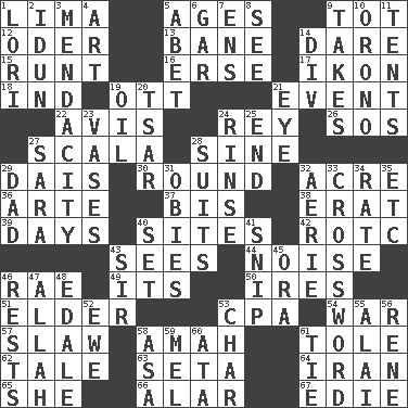 ACROSS 1. Pale green bean 5. Eons 9. Small child 12. Baltic tributary 13. Object of repulsion 14. Have the gumption 15. Undersized animal 16. Celtic language 17. Picture 18. Working for oneself (abbr.) 19. Baseball player Mel 21. Incident 22. Opinion 24. Marina Del _, California 26. Distress signal 27. Any of the three canals of the cochlea 28. Trig term 29. Raised platform 30. Having a circular shape 32. Measure of real estate 36. Johnson of "Laugh-In" 37. Altar cloth linen 38. Part of Q.E.F. 39. 24-hour periods 40. Locates 42. College mil. group 43. Observes 44. Annoying sound 46. Actress Charlotte 49. ___ a Wonderful Life 50. Angers 51. A person who is older than you are 53. Numbers guy (abbr.) 54. Armed conflict 57. Cole _ (cabbage dish) 58. Nursemaid 61. Lacquered or enameled metalware 62. Lie 63. Bristle 64. SW Asia republic 65. A female animal or person 66. Having or resembling wings 67. Singer Brickell DOWN 1. Australian parrot (variant) 2. Goddess of spring and wife of Bragi 3. Ananias' fault 4. Nonscientific branch of learning 5. Collude with 6. Slender fish 7. Followers of ems 8. Perceive with the eye 9. Receives possession of 10. U. of Maine site 11. Portable shelters 14. HTML Container Element 19. Lubricate 20. Russian ruler of old 21. Sight organ 23. Flower holders 24. Remove soap 25. Conclude 27. "Two Mules for Sister ____" 28. Costumes for special activities 29. June honoree 31. Off-Broadway awards 32. Nest on high 33. What you're doing now 34. Pace 35. And so on (abbr.) 40. Put into a specified state 41. Clip 43. Title for a knight 45. Mouth or opening 46. Musical pauses 47. Assad's deity 48. Peak District village in England 52. She-sheep 53. Burn to charcoal 55. Jai _ 56. French philosopher Descartes 58. White ___ sheet 59. Cartoonist voice _ Blanc 60. "One Day ___ Time" 61. Standoff