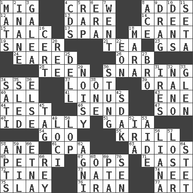 ACROSS 1. Russian fighter aircraft 4. Group working together 8. Does sums 12. Santa ___, CA 13. Have the gumption 14. Algonquian 15. Baby powder 17. Connect, as a bridge 18. Intended 19. Contemptuous expression 21. Beverage made from leaves 23. Girls' org. (abbr.) 24. Having ears or earlike features 26. Globe 28. Adolescent 30. Catching in a trap 34. Compass dir. 37. Spoils 39. Spoken 40. 100% 41. "_ and Lucy" (Charlie Brown theme song) 43. Compass dir. 44. Trial 46. Transmit 47. Male child 48. Under perfect conditions 51. Greek goddess of the earth (variant) 54. Thick or sticky substance 55. The principal food of baleen whales 58. One (Scot) 61. Numbers guy (abbr.) 63. Goodbye (Sp.) 65. _ dish (used to culture cells) 67. Republicans 71. 90 degrees 72. Prong on a fork 73. Nathan's nickname 74. Born 75. Kill 76. SW Asia republic 77. Tate display DOWN 1. Floor protectors 2. Silly 3. An organ shaped like a helmet 4. Music discs 5. Reproach for some lapse or misdeed 6. Period 7. Gone 8. Adept person 9. To draw with force 10. Habitations of wild animals 11. Bristle 16. Sure thing 18. Hindu Mythology: god of death 20. To sift 22. Period of immesurable duration 25. Small valley 27. Sis' sibling 29. Annoyingly loud 30. Feeling sharp psychological pain 31. Angers 32. Billionth: prefix 33. Small, secluded valley 34. Suttee (variant) 35. Downhill vehicle 36. Otherwise 38. Single 42. Neighbor of Neb. 45. Label 49. Event scenes 50. Trim (branches) 52. Retirement account (abbr.) 53. Assistant 56. Climbing, woody, usually tropical vines 57. Failure 58. Flats, for short 59. Famous astronaut Armstrong 60. Inactive volcano in Sicily 62. Hindu god of fire 64. Proofreading order 66. Marina Del _, California 68. Rowing implement 69. Parent Teacher Assoc. 70. Elected rep.